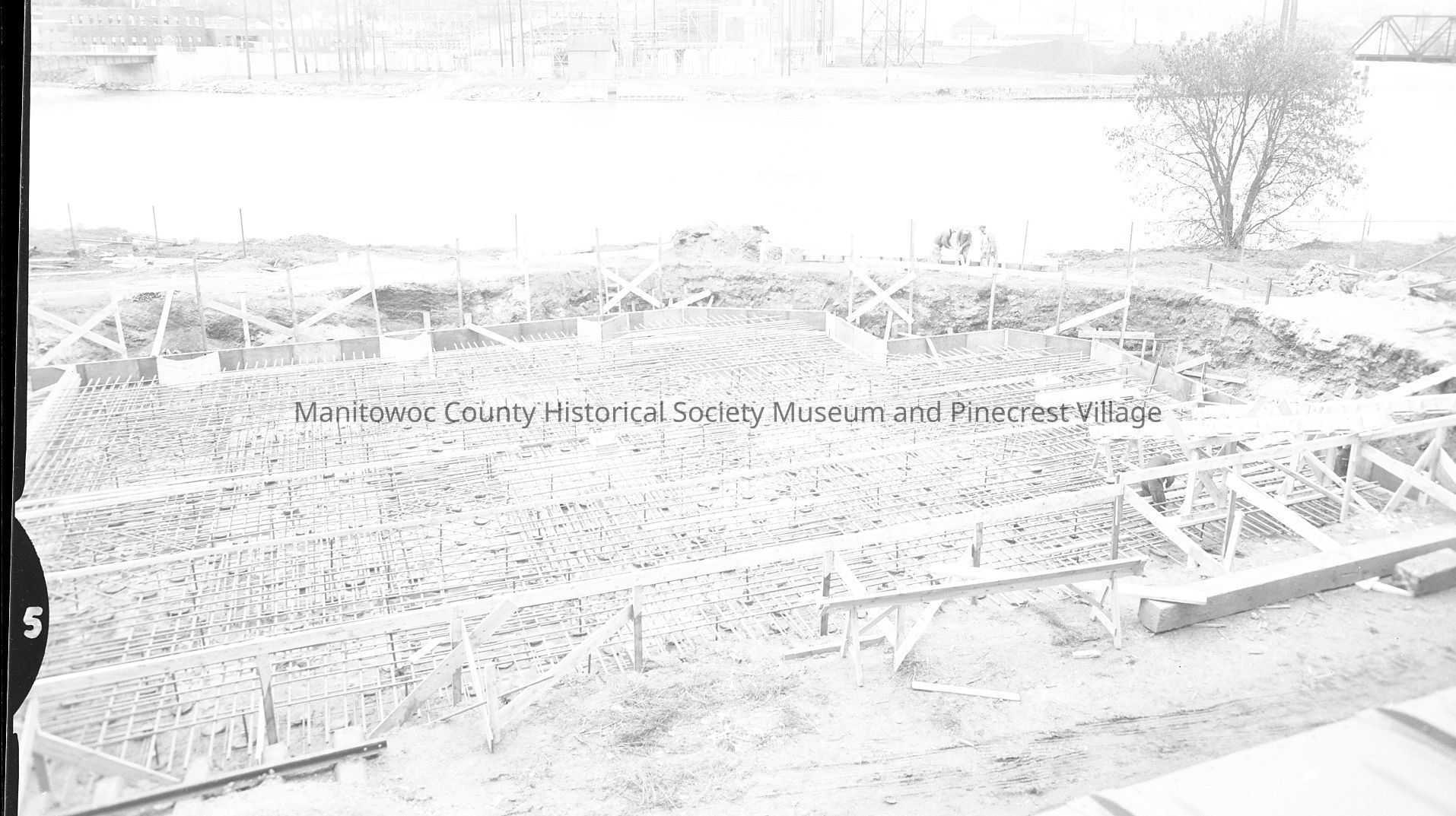 WI Malting Company, 633 South 20th Street Manitowoc, foundation for silos. Across river is old WI Public Service power plant, 105 Revere Dr. Photograph taken on November 5th, 1957.Made/Created