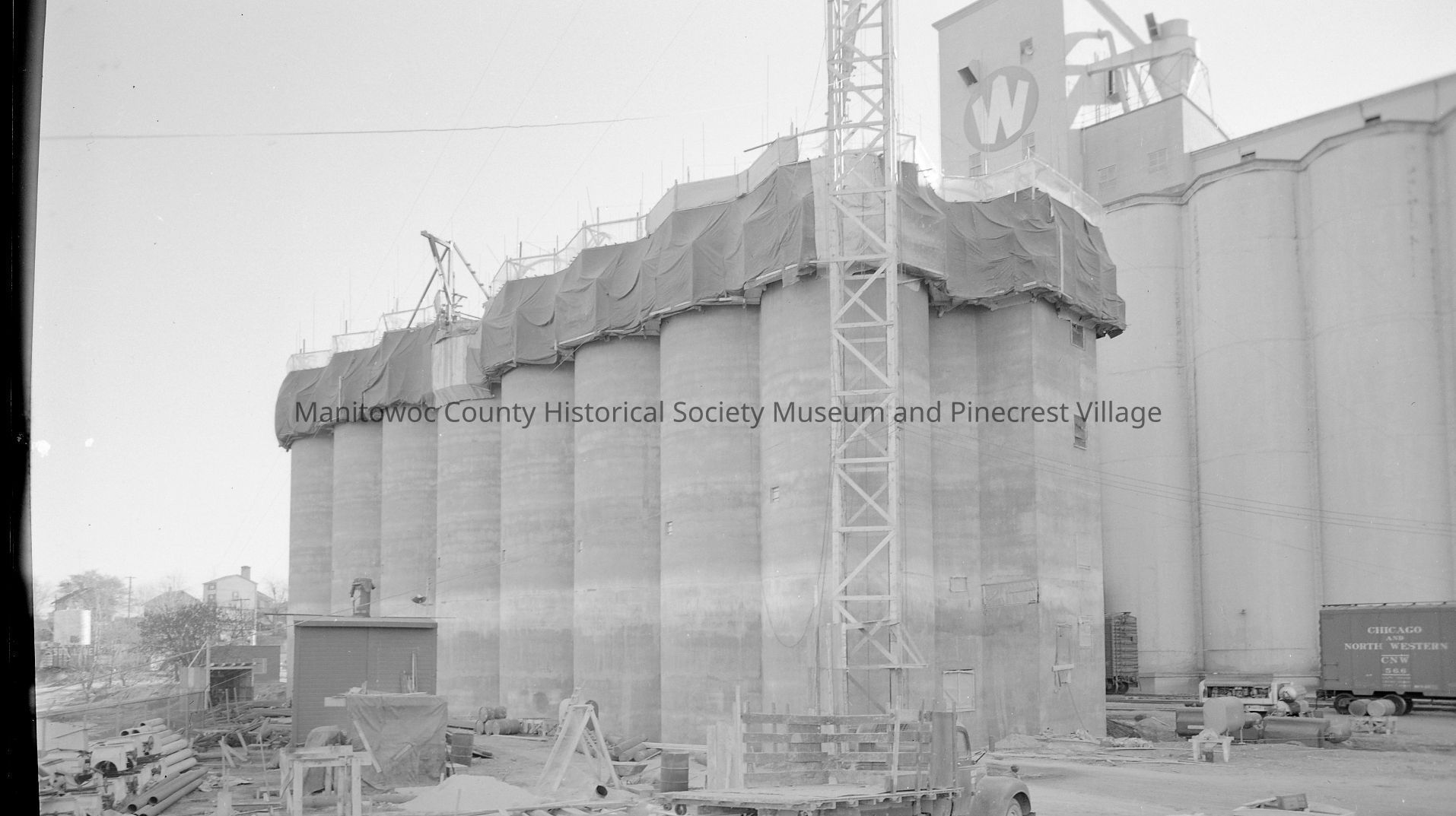 WI Malting Company, 633 South 20th Street Manitowoc, new silos going up. Photograph taken on December 12th, 1957.Made/Created