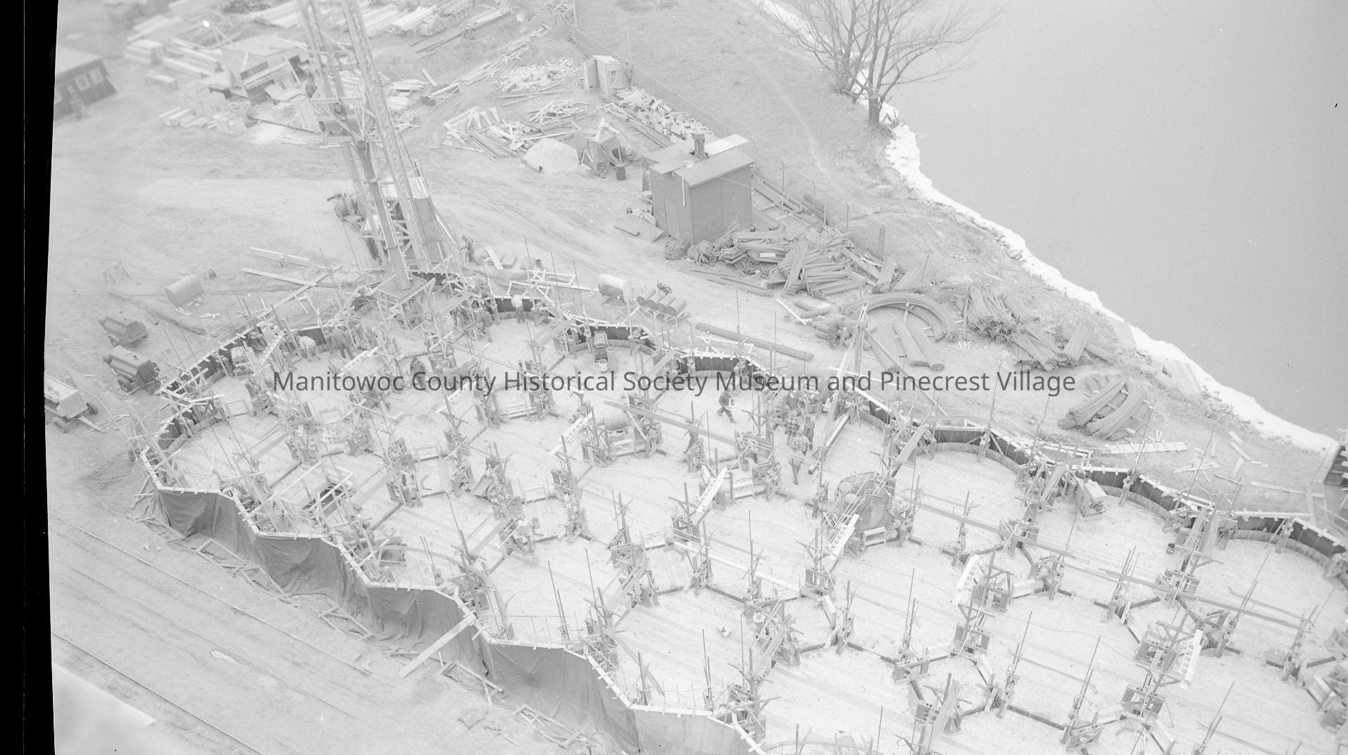 WI Malting Company, 633 South 20th Street Manitowoc, looking down at new silos. Photograph taken on Deccember 9th, 1957.Made/Created