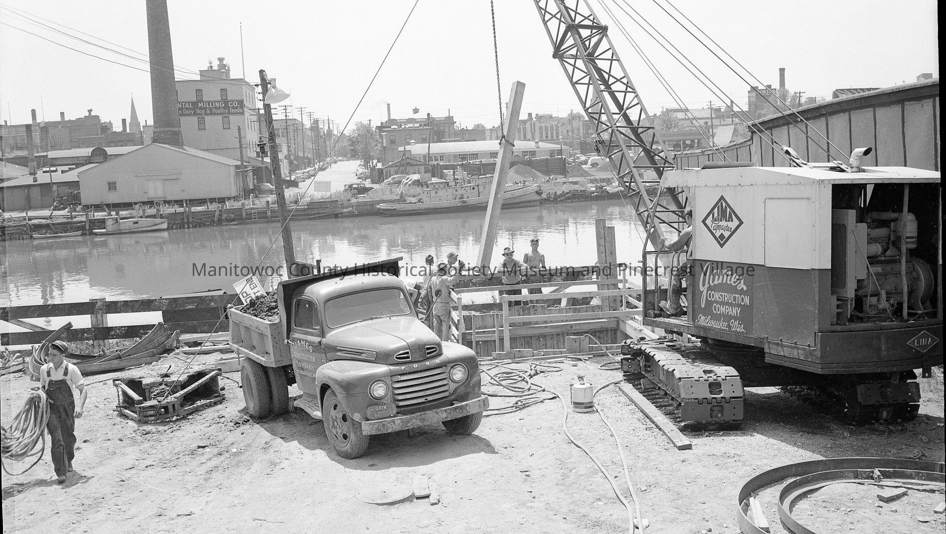 WI Telephone Company, 820 Buffalo Street Manitowoc, running telephone cables under Manitowoc River at end of North 9th Street. Across river is South 9th & Quay Street. Oriental Milling Company, 822 Quay Street. Photograph taken in 1950.Made/Created