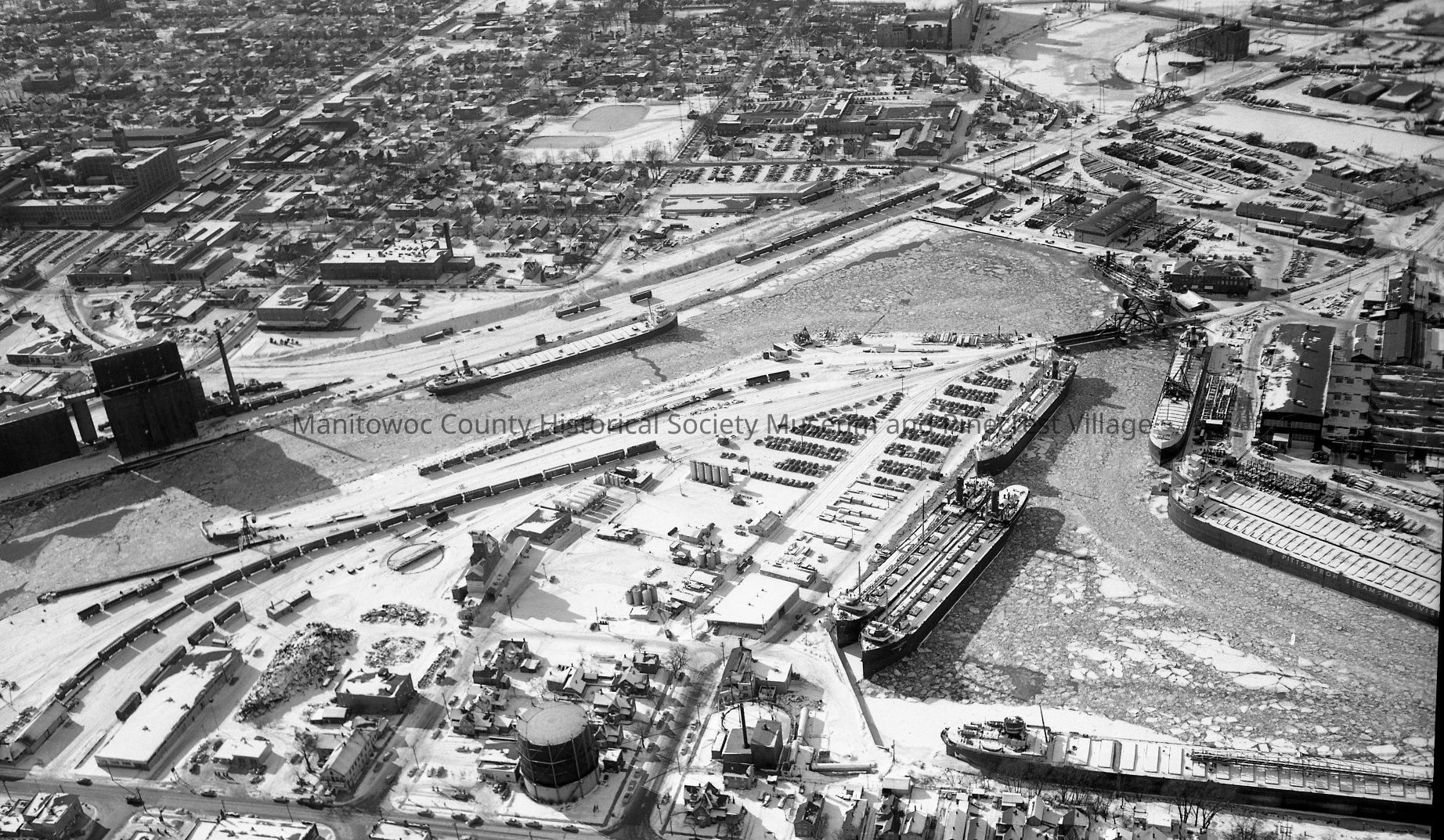 Aerial view of the winter fleet at Manitowoc. At left edge is old Elevator B on South Water Street. Photograph taken on January 30th, 1957.Made/Created
