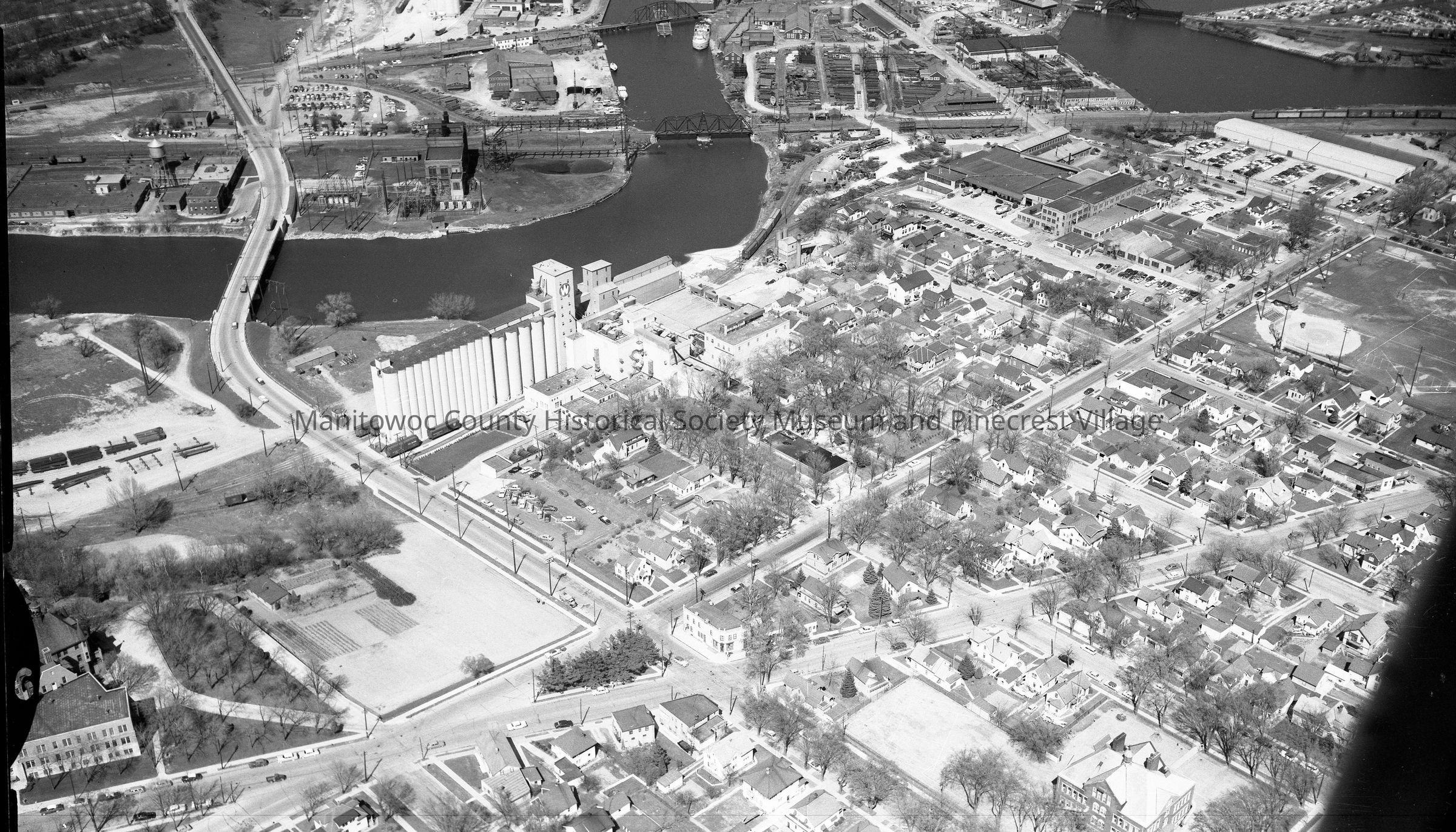 Aerial view of the Wisconsin Malting and 21st Street bridge Manitowoc. At top is Manitowoc Portland Cement and at left lower edge is Holy Family Hospital. Photograph taken on April 30th, 1957.Made/Created