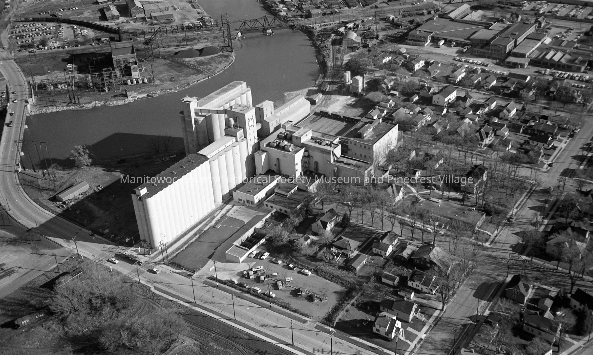 Aerial: Wisconsin Malting Company, 605 South 21st Street Manitowoc. Across river is the Wisconsin Public Service power plant, 105 South Revere Drive. At top is Manitowoc Portland Cement Company on Spring Street; Manitowoc Shipbuilding where they are building the "Adam E. Cornelius".