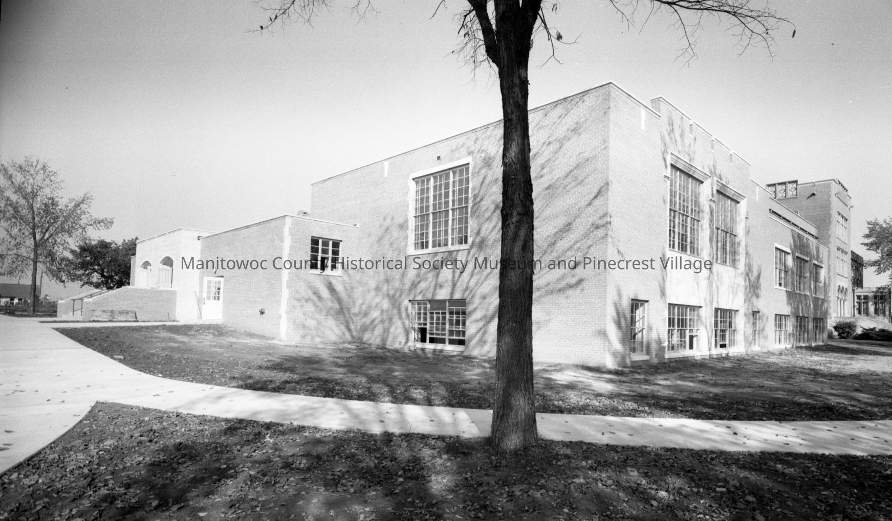 School - Woodrow Wilson Junior High, 1201 North 11th Street Manitowoc, looking at west end with new addition & auditorium. Photograph taken in October 1958.Made/Created