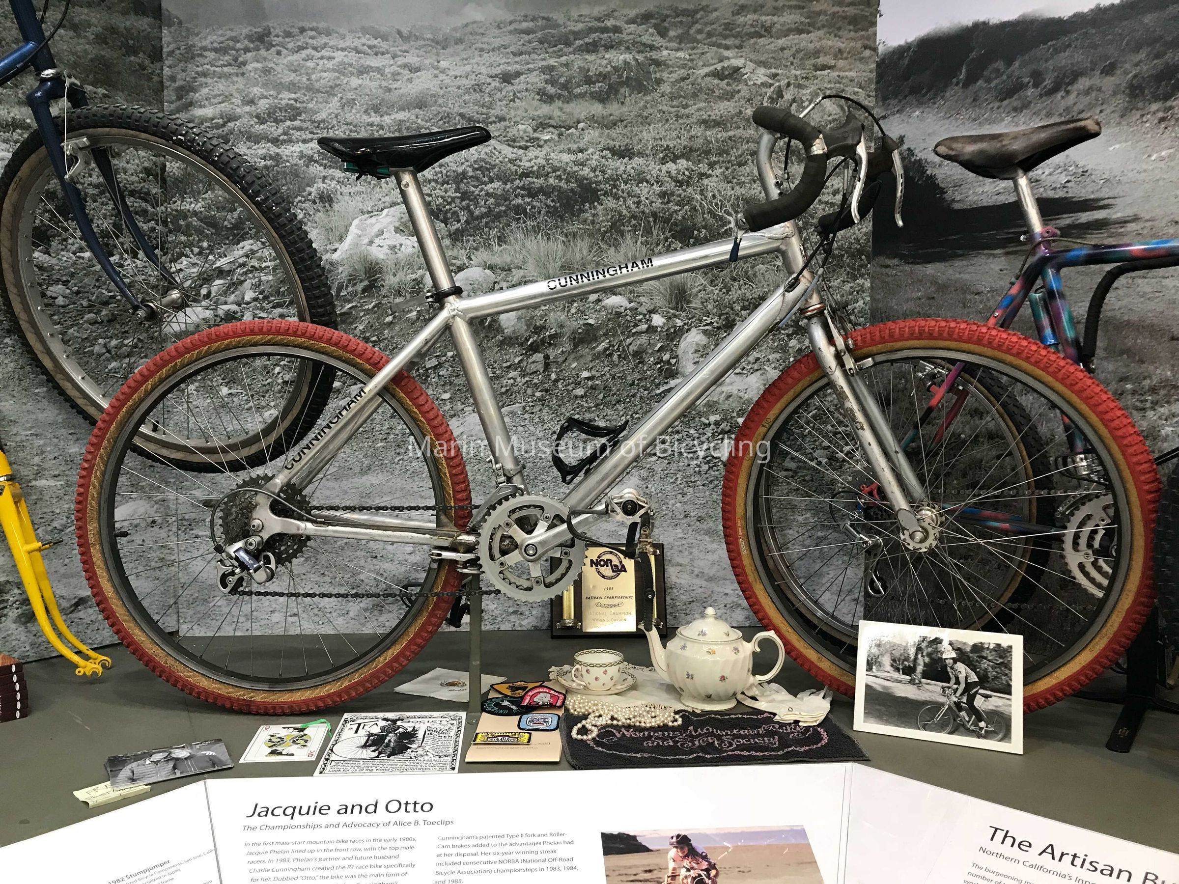 In the first mass-start mountain bike races in the early 1980s, Jacquie Phelan lined up in the front row, with the top male racers. In 1983, Phelan's partner and future husband Charlie Cunningham created the R1 race bike specifically for her. Dubbed “Otto,” the bike was the main form of transportation for car-less Phelan. Cunningham’s heat-treated, thin-walled aluminum frame ensured a lifetime’s worthiness over rough terrain at high speeds, while giving Phelan the distinct advantage of a bike that was lighter and stiffer than other racing mountain bikes. Otto’s double (instead of triple) chainring and modified rear cogset with eleven-tooth gear helped reduce the bike’s overall weight and reflected Cunningham’s impulse for efficiency through simplification.