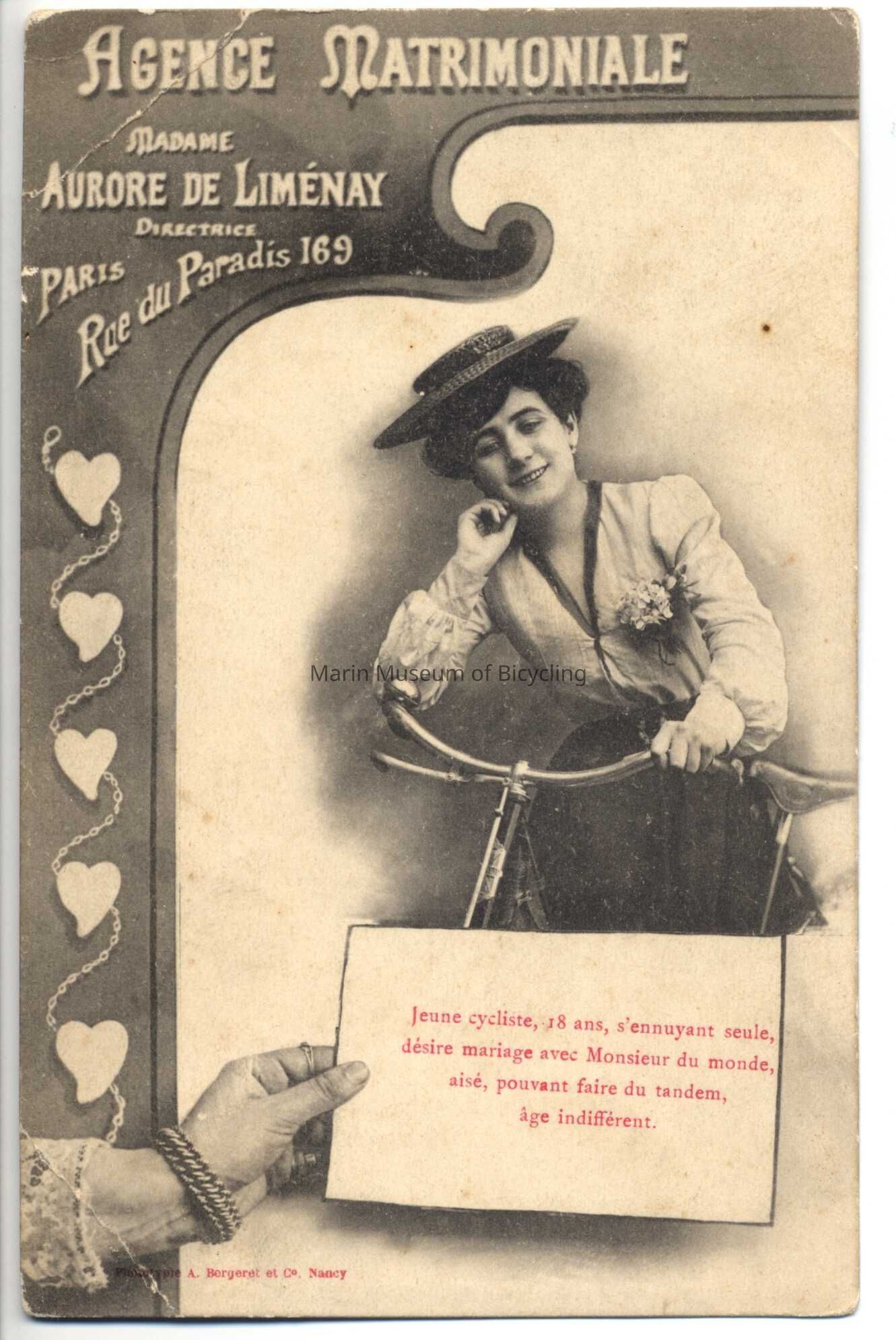 Young woman, age 18, desires marriage with a man who can ride a tandem with her.Postcard Details