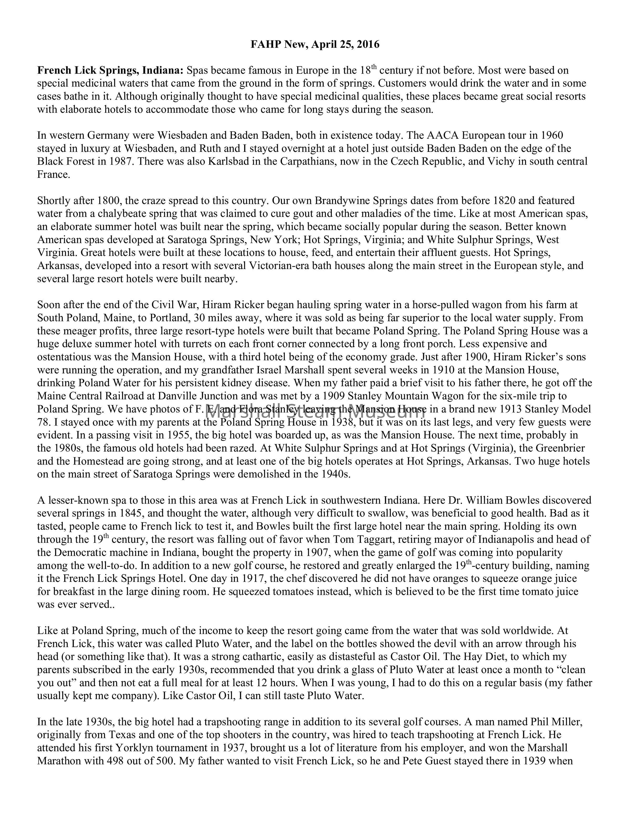 Soon after the end of the Civil War, Hiram Ricker began hauling spring water in a horse-pulled wagon from his farm at South Poland, Maine, to Portland, 30 miles away, where it was sold as being far superior to the local water supply. From these meager profits, three large resort-type hotels were built that became Poland Spring. The Poland Spring House was a huge deluxe summer hotel with turrets on each front corner connected by a long front porch. Less expensive and ostentatious was the Mansion House, with a third hotel being of the economy grade. Just after 1900, Hiram Ricker’s sons were running the operation, and my grandfather Israel Marshall spent several weeks in 1910 at the Mansion House, drinking Poland Water for his persistent kidney disease. When my father paid a brief visit to his father there, he got off the Maine Central Railroad at Danville Junction and was met by a 1909 Stanley Mountain Wagon for the six-mile trip to Poland Spring. We have photos of F. E. and Flora Stanley leaving the Mansion House in a brand new 1913 Stanley Model 78. I stayed once with my parents at the Poland Spring House in 1938, but it was on its last legs, and very few guests were evident. In a passing visit in 1955, the big hotel was boarded up, as was the Mansion House. The next time, probably in the 1980s, the famous old hotels had been razed. At White Sulphur Springs and at Hot Springs (Virginia), the Greenbrier and the Homestead are going strong, and at least one of the big hotels operates at Hot Springs, Arkansas. Two huge hotels on the main street of Saratoga Springs were demolished in the 1940s.