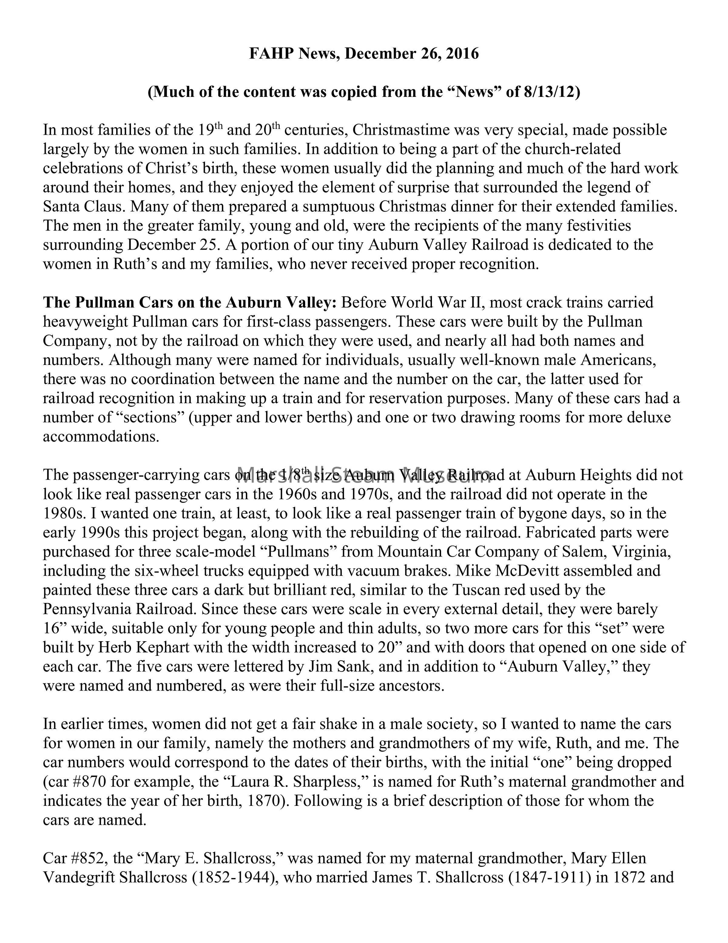 In most families of the 19th and 20th centuries, Christmastime was very special, made possible largely by the women in such families. In addition to being a part of the church-related celebrations of Christ’s birth, these women usually did the planning and much of the hard work around their homes, and they enjoyed the element of surprise that surrounded the legend of Santa Claus. Many of them prepared a sumptuous Christmas dinner for their extended families. The men in the greater family, young and old, were the recipients of the many festivities surrounding December 25. A portion of our tiny Auburn Valley Railroad is dedicated to the women in Ruth’s and my families, who never received proper recognition.