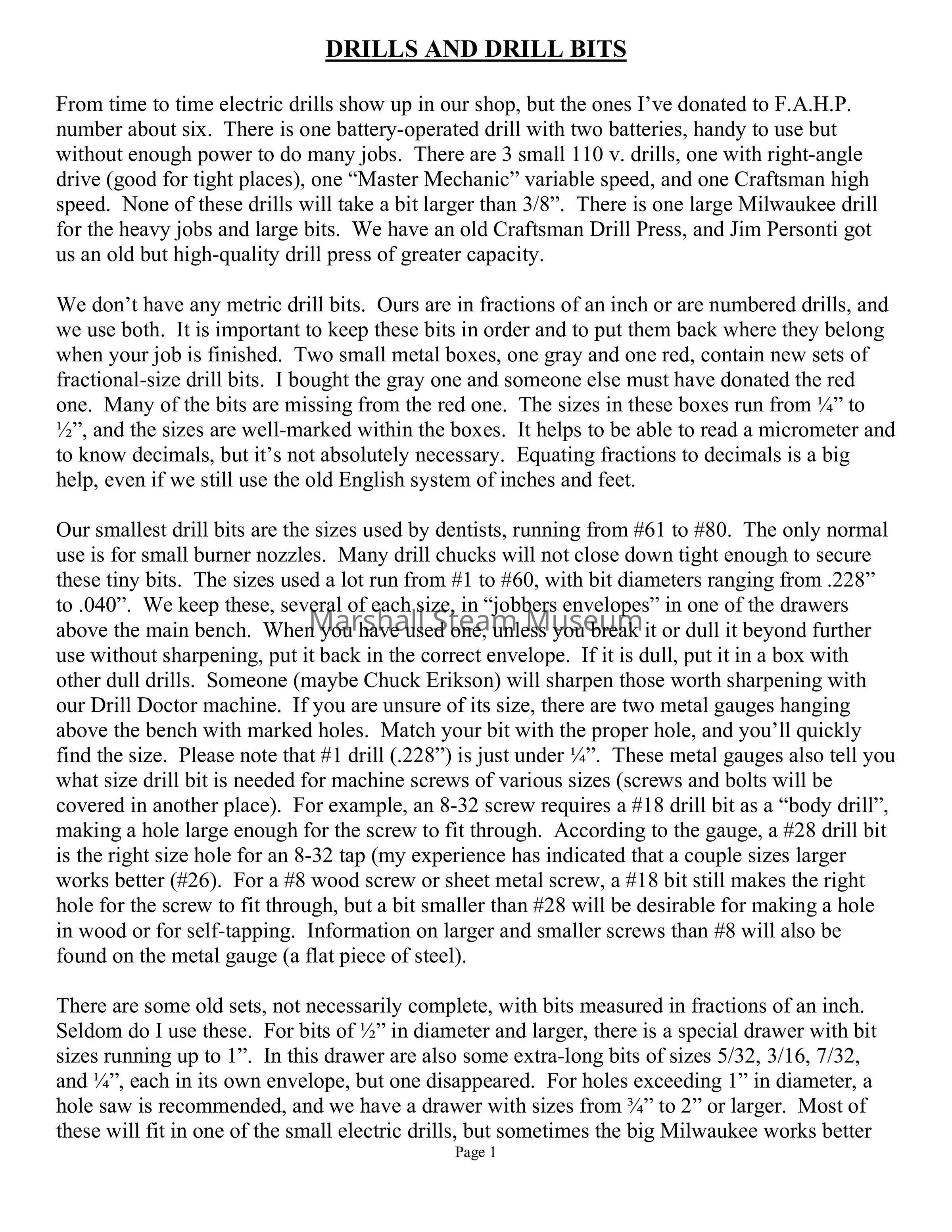 Our smallest drill bits are the sizes used by dentists, running from #61 to #80. The only normal use is for small burner nozzles. Many drill chucks will not close down tight enough to secure these tiny bits. The sizes used a lot run from #1 to #60, with bit diameters ranging from .228” to .040”. We keep these, several of each size, in “jobbers envelopes” in one of the drawers above the main bench. When you have used one, unless you break it or dull it beyond further use without sharpening, put it back in the correct envelope. If it is dull, put it in a box with other dull drills. Someone (maybe Chuck Erikson) will sharpen those worth sharpening with our Drill Doctor machine. If you are unsure of its size, there are two metal gauges hanging above the bench with marked holes. Match your bit with the proper hole, and you’ll quickly find the size. Please note that #1 drill (.228”) is just under ¼”. These metal gauges also tell you what size drill bit is needed for machine screws of various sizes (screws and bolts will be covered in another place). For example, an 8-32 screw requires a #18 drill bit as a “body drill”, making a hole large enough for the screw to fit through. According to the gauge, a #28 drill bit is the right size hole for an 8-32 tap (my experience has indicated that a couple sizes larger works better (#26). For a #8 wood screw or sheet metal screw, a #18 bit still makes the right hole for the screw to fit through, but a bit smaller than #28 will be desirable for making a hole in wood or for self-tapping. Information on larger and smaller screws than #8 will also be found on the metal gauge (a flat piece of steel).