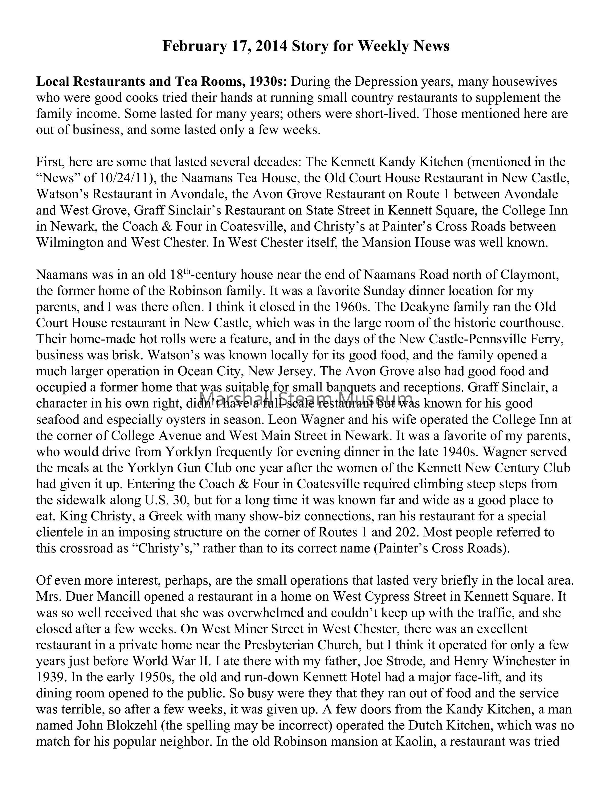 First, here are some that lasted several decades: The Kennett Kandy Kitchen (mentioned in the “News” of 10/24/11), the Naamans Tea House, the Old Court House Restaurant in New Castle, Watson’s Restaurant in Avondale, the Avon Grove Restaurant on Route 1 between Avondale and West Grove, Graff Sinclair’s Restaurant on State Street in Kennett Square, the College Inn in Newark, the Coach & Four in Coatesville, and Christy’s at Painter’s Cross Roads between Wilmington and West Chester. In West Chester itself, the Mansion House was well known.