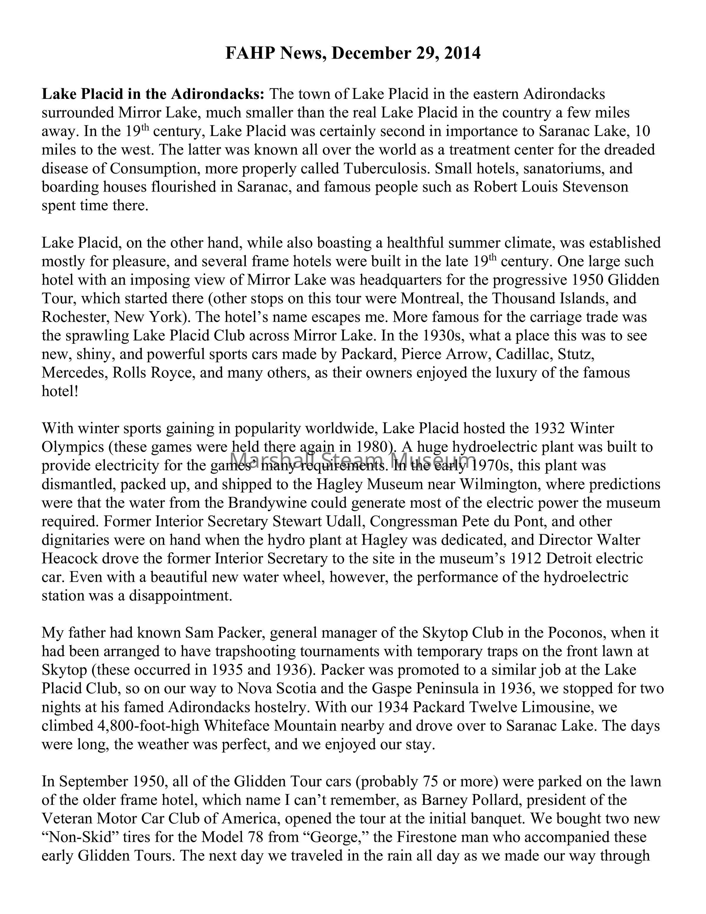 Lake Placid, on the other hand, while also boasting a healthful summer climate, was established mostly for pleasure, and several frame hotels were built in the late 19th century. One large such hotel with an imposing view of Mirror Lake was headquarters for the progressive 1950 Glidden Tour, which started there (other stops on this tour were Montreal, the Thousand Islands, and Rochester, New York). The hotel’s name escapes me. More famous for the carriage trade was the sprawling Lake Placid Club across Mirror Lake. In the 1930s, what a place this was to see new, shiny, and powerful sports cars made by Packard, Pierce Arrow, Cadillac, Stutz, Mercedes, Rolls Royce, and many others, as their owners enjoyed the luxury of the famous hotel!