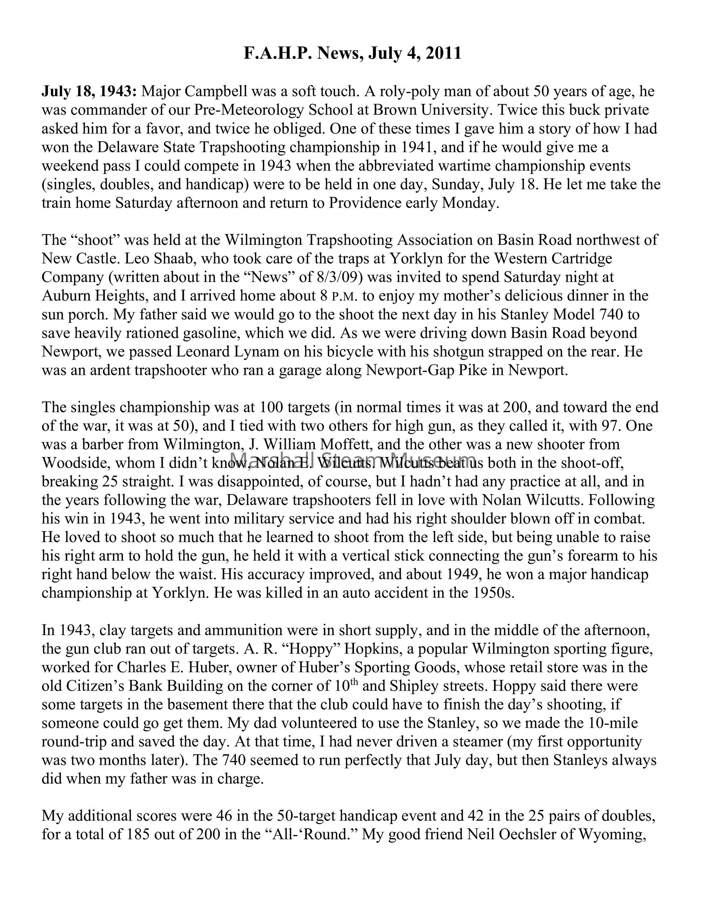 July 18, 1943: Major Campbell was a soft touch. A roly-poly man of about 50 years of age, he was commander of our Pre-Meteorology School at Brown University. Twice this buck private asked him for a favor, and twice he obliged. One of these times I gave him a story of how I had won the Delaware State Trapshooting championship in 1941, and if he would give me a weekend pass I could compete in 1943 when the abbreviated wartime championship events (singles, doubles, and handicap) were to be held in one day, Sunday, July 18. He let me take the train home Saturday afternoon and return to Providence early Monday.