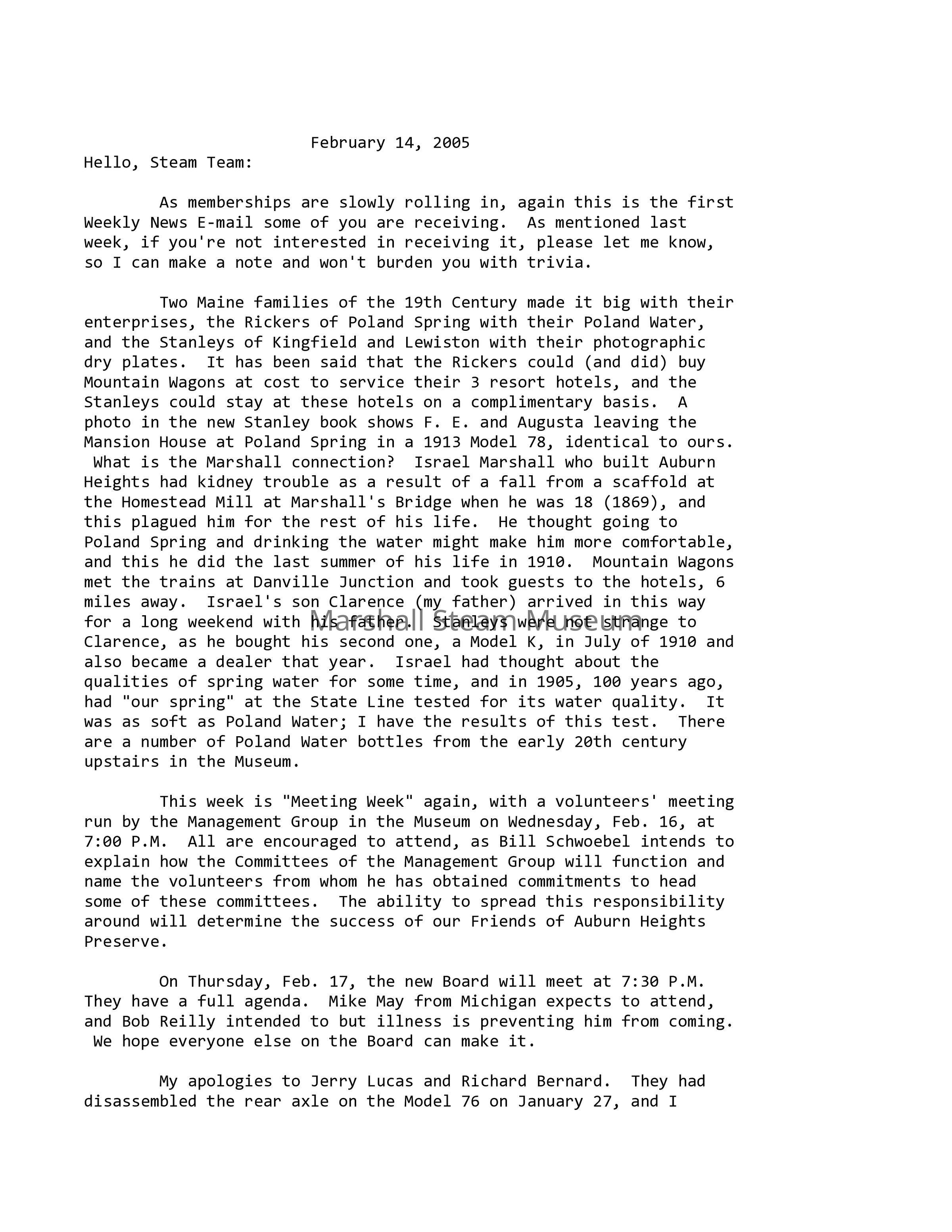 The Stanleys and the Rickers of Maine: Two Maine families of the 19th century made it big with their enterprises: the Rickers of Poland Spring with their Poland Water and the Stanleys of Kingfield and Lewiston with their photographic dry plates. It has been said that the Rickers could (and did) buy Mountain Wagons at cost to service their three resort hotels, and the Stanleys could stay at these hotels on a complimentary basis. A photo in the new Stanley book (The Stanley Steamer: America’s Legendary Steam Car, by Kit Foster) shows F. E. and Augusta leaving the mansion house at Poland Spring in a 1913 Model 78, identical to ours. What is the Marshall connection? Israel Marshall, who built Auburn Heights, had kidney trouble as a result of a fall from a scaffold at the Homestead Mill at Marshall’s Bridge when he was 18 (in 1869), and this plagued him for the rest of his life. He thought going to Poland Spring and drinking the water might make him more comfortable, and this he did the last summer of his life in 1910. Mountain Wagons met the trains at Danville Junction and took guests to the hotels, 6 miles away. Israel’s son Clarence (my father) arrived in this way for a long weekend with his father. Stanleys were not strange to Clarence as he bought his second one, a Model K, in July of 1910 and also became a Stanley dealer that year. Israel had thought about the qualities of spring water for some time and in 1905 had “our spring” at the state line tested for its water quality. It was as soft as Poland Water; I have the results of this test. There are a number of Poland Water bottles from the early 20th century upstairs in the Museum.