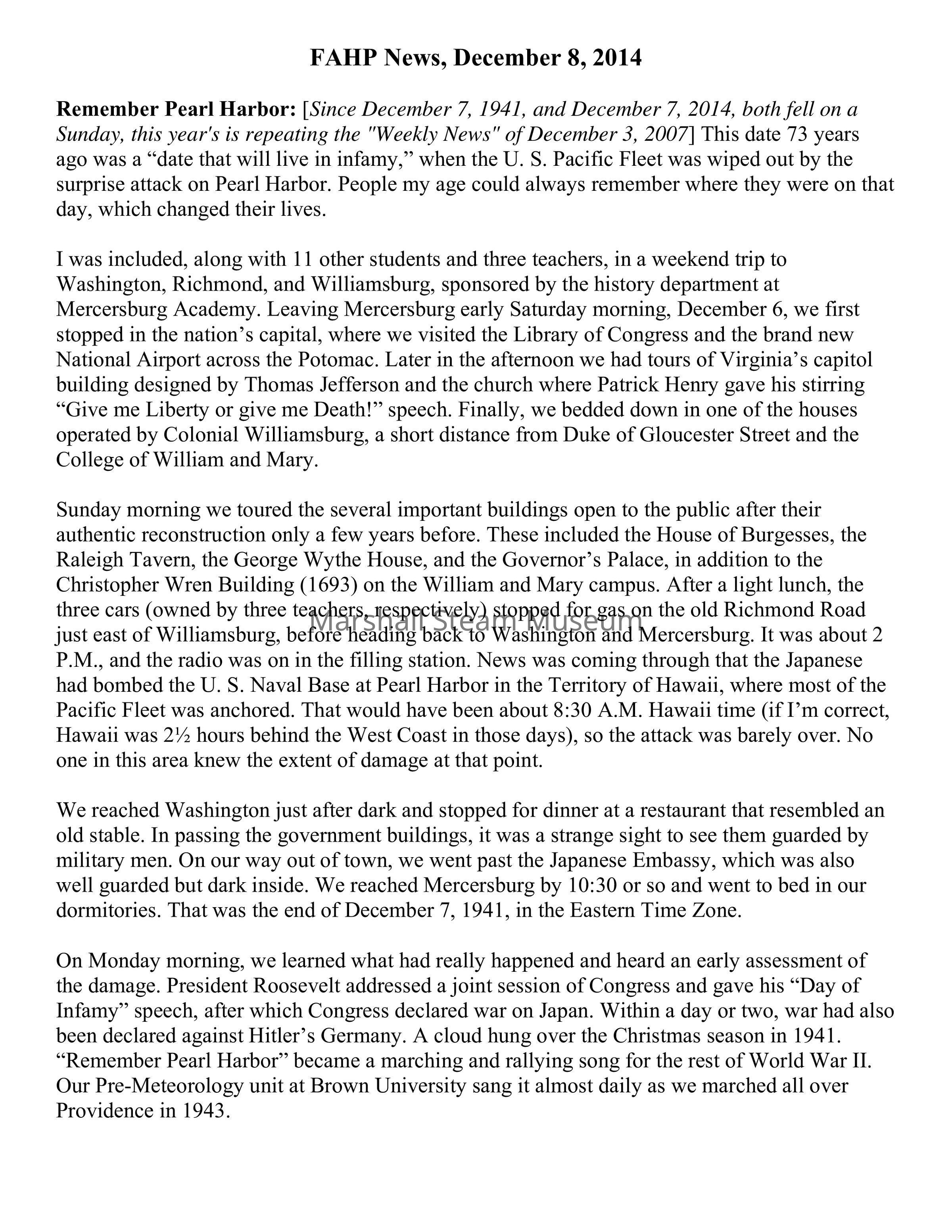 Remember Pearl Harbor: [Since December 7, 1941, and December 7, 2014, both fell on a Sunday, this year's is repeating the "Weekly News" of December 3, 2007] This date 73 years ago was a “date that will live in infamy,” when the U. S. Pacific Fleet was wiped out by the surprise attack on Pearl Harbor. People my age could always remember where they were on that day, which changed their lives.