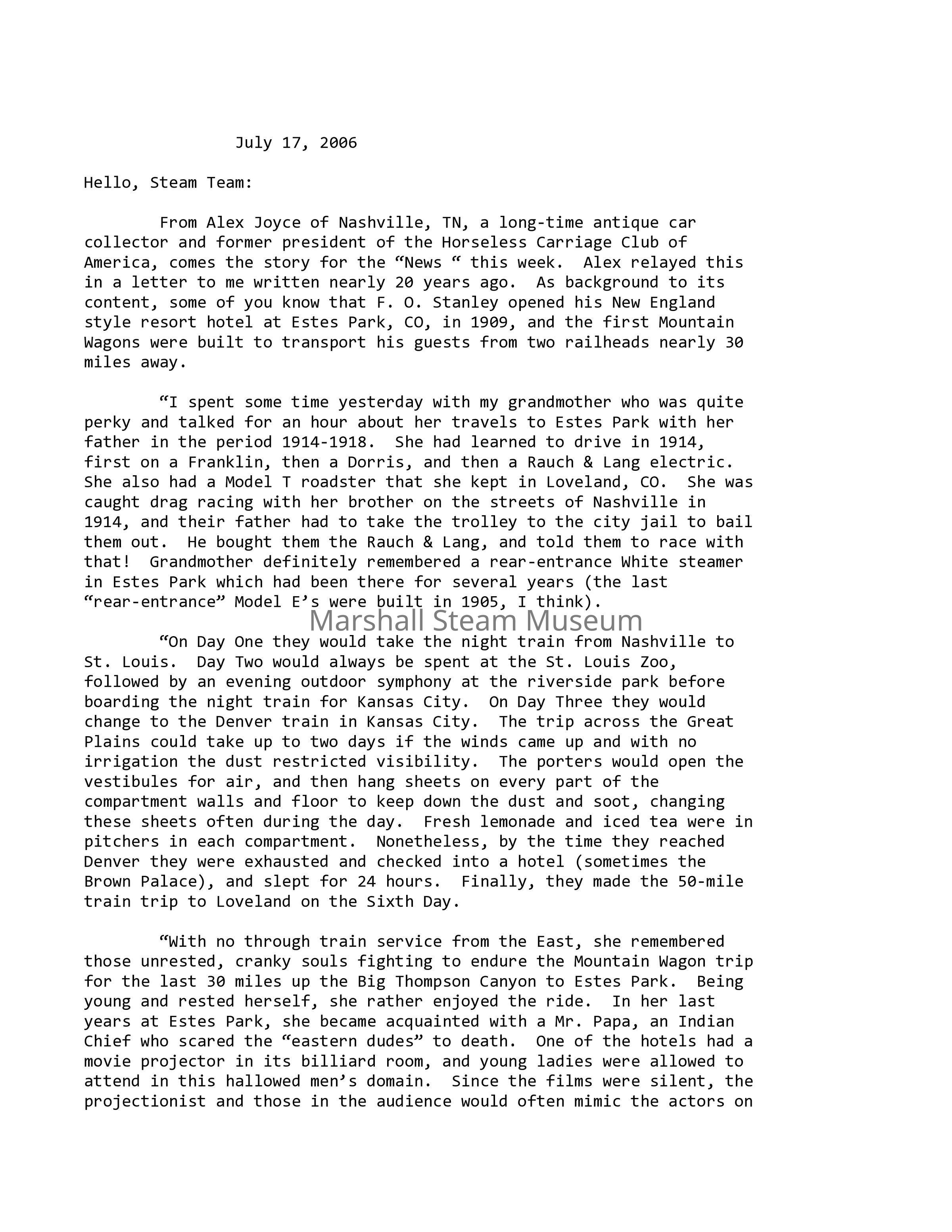 From Alex Joyce of Nashville, TN, a long-time antique car collector and former president of the Horseless Carriage Club of America, comes the story for the “News “ this week. Alex relayed this in a letter to me written nearly 20 years ago. As background to its content, some of you know that F. O. Stanley opened his New England style resort hotel at Estes Park, CO, in 1909, and the first Mountain Wagons were built to transport his guests from two railheads nearly 30 miles away.
