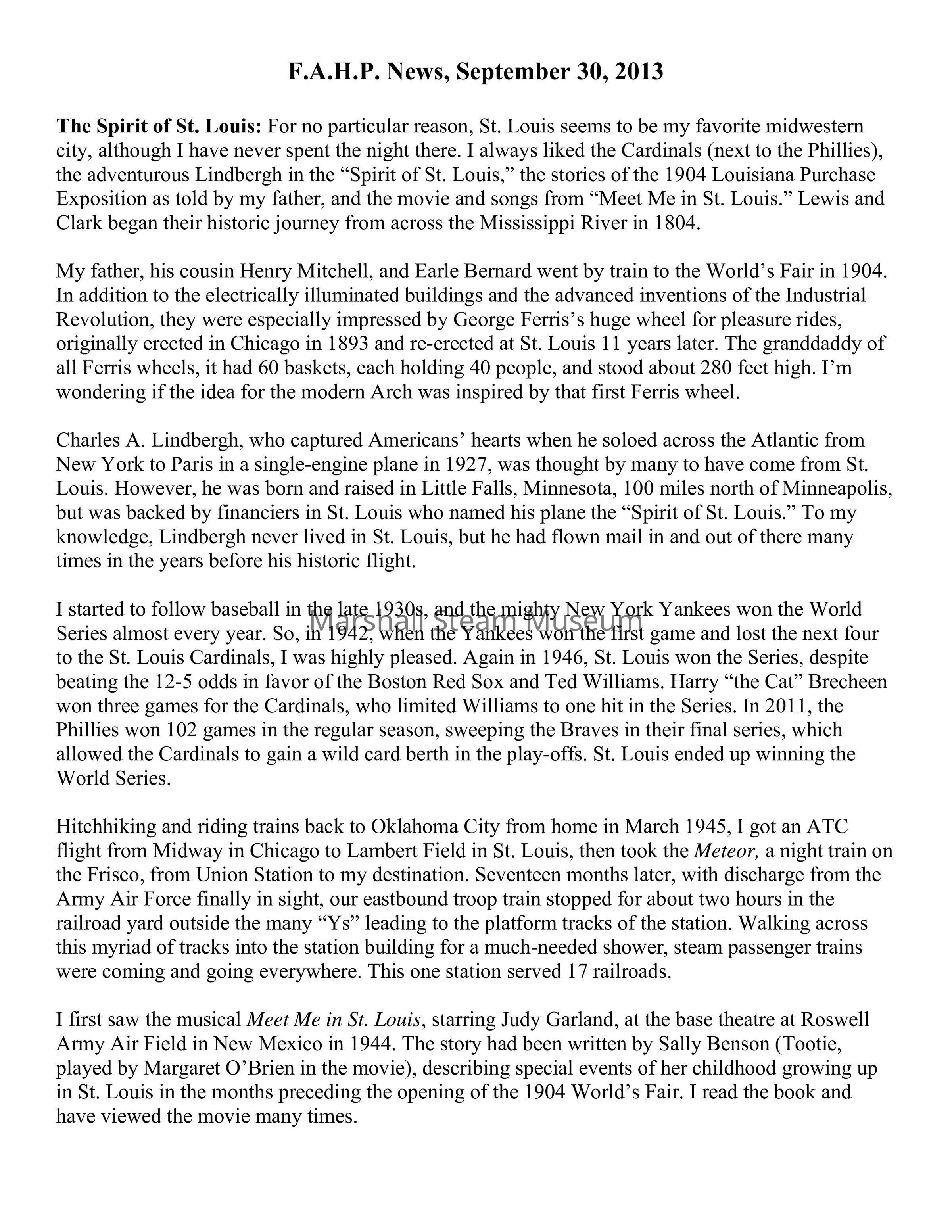 The Spirit of St. Louis: For no particular reason, St. Louis seems to be my favorite midwestern city, although I have never spent the night there. I always liked the Cardinals (next to the Phillies), the adventurous Lindbergh in the “Spirit of St. Louis,” the stories of the 1904 Louisiana Purchase Exposition as told by my father, and the movie and songs from “Meet Me in St. Louis.” Lewis and Clark began their historic journey from across the Mississippi River in 1804.
