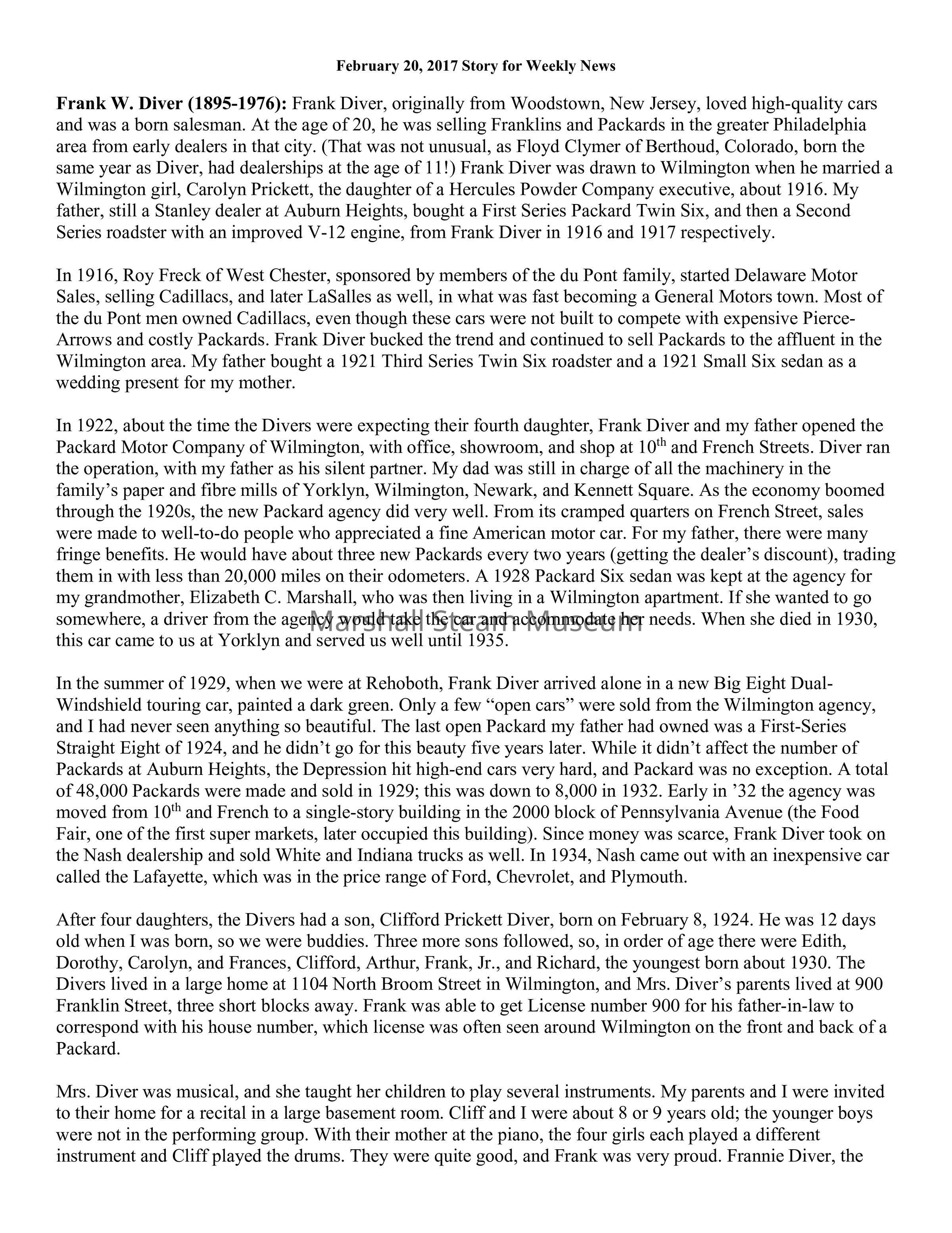 Frank W. Diver (1895-1976): Frank Diver, originally from Woodstown, New Jersey, loved high-quality cars and was a born salesman. At the age of 20, he was selling Franklins and Packards in the greater Philadelphia area from early dealers in that city. (That was not unusual, as Floyd Clymer of Berthoud, Colorado, born the same year as Diver, had dealerships at the age of 11!) Frank Diver was drawn to Wilmington when he married a Wilmington girl, Carolyn Prickett, the daughter of a Hercules Powder Company executive, about 1916. My father, still a Stanley dealer at Auburn Heights, bought a First Series Packard Twin Six, and then a Second Series roadster with an improved V-12 engine, from Frank Diver in 1916 and 1917 respectively.
