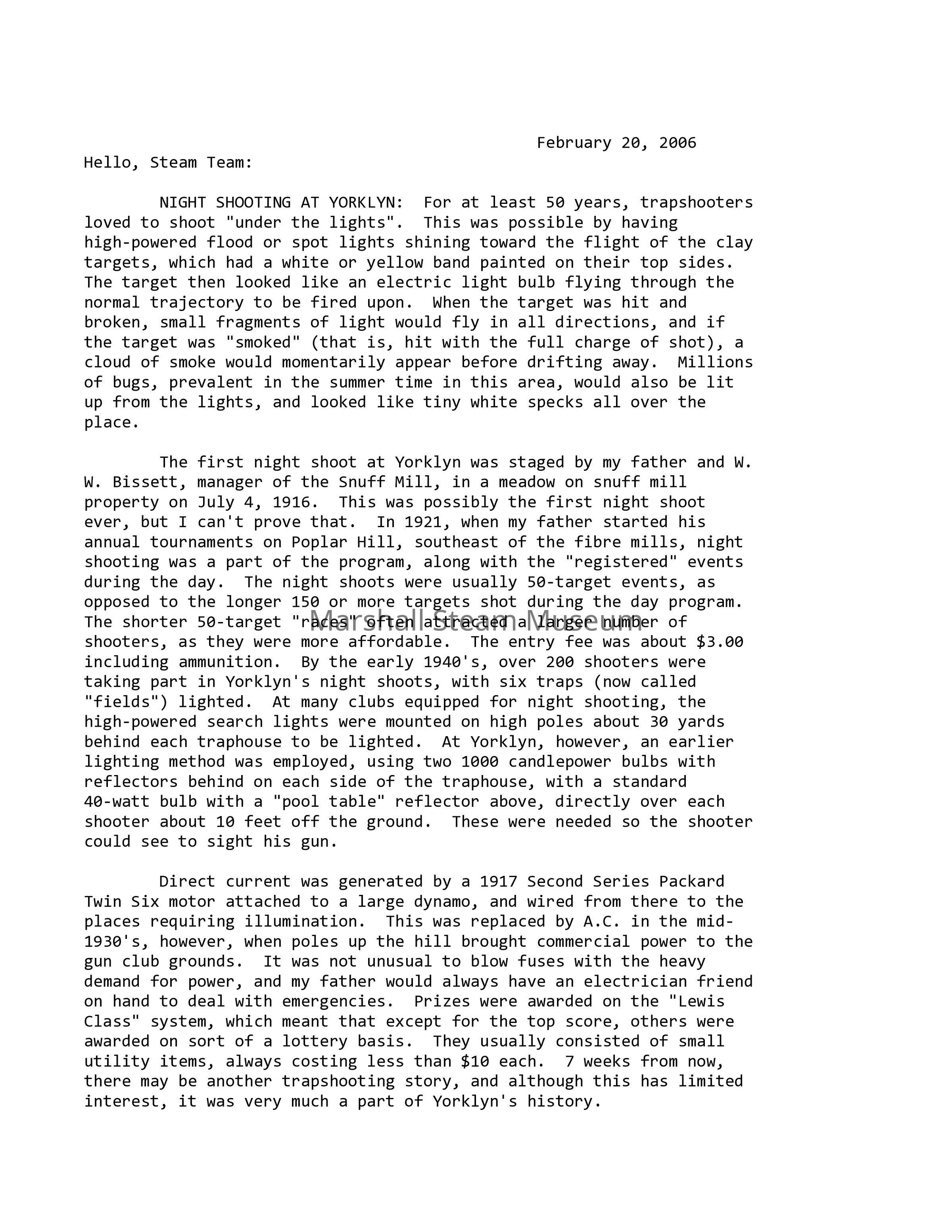 The first night shoot at Yorklyn was staged by my father and W. W. Bissett, manager of the Snuff Mill, in a meadow on snuff mill property on July 4, 1916. This was possibly the first night shoot ever, but I can't prove that. In 1921, when my father started his annual tournaments on Poplar Hill, southeast of the fibre mills, night shooting was a part of the program, along with the "registered" events during the day. The night shoots were usually 50-target events, as opposed to the longer 150 or more targets shot during the day program. The shorter 50-target "races" often attracted a larger number of shooters, as they were more affordable. The entry fee was about $3.00 including ammunition. By the early 1940's, over 200 shooters were taking part in Yorklyn's night shoots, with six traps (now called "fields") lighted. At many clubs equipped for night shooting, the high-powered search lights were mounted on high poles about 30 yards behind each traphouse to be lighted. At Yorklyn, however, an earlier lighting method was employed, using two 1000 candlepower bulbs with reflectors behind on each side of the traphouse, with a standard 40-watt bulb with a "pool table" reflector above, directly over each shooter about 10 feet off the ground. These were needed so the shooter could see to sight his gun.