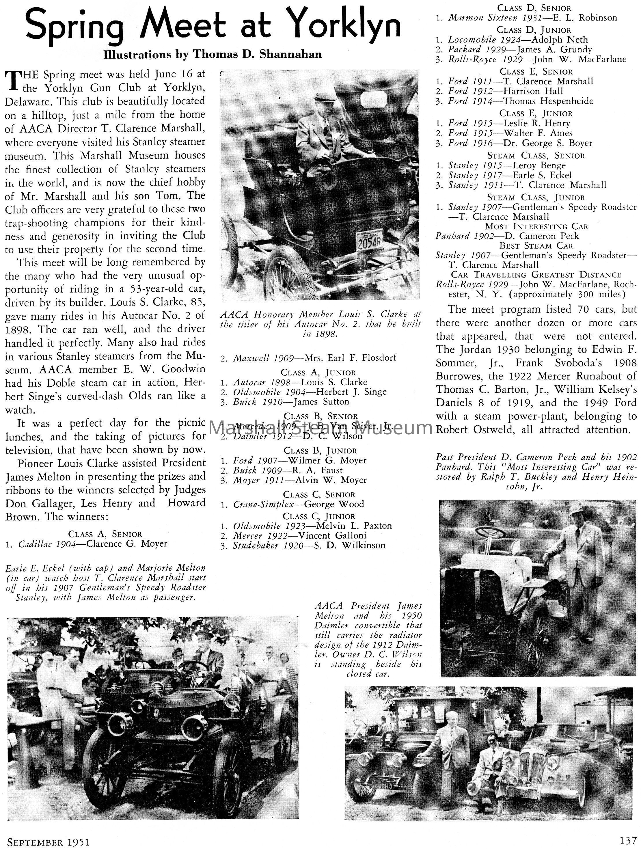 Photocopy of the report of the 1951 AACA Spring Meet at the Yorklyn Gun Clun in Yorklyn, DE. This meet was unique because T Clarence Marshall was the AACA Director and also the meet was attended by James Melton who was AACA President.