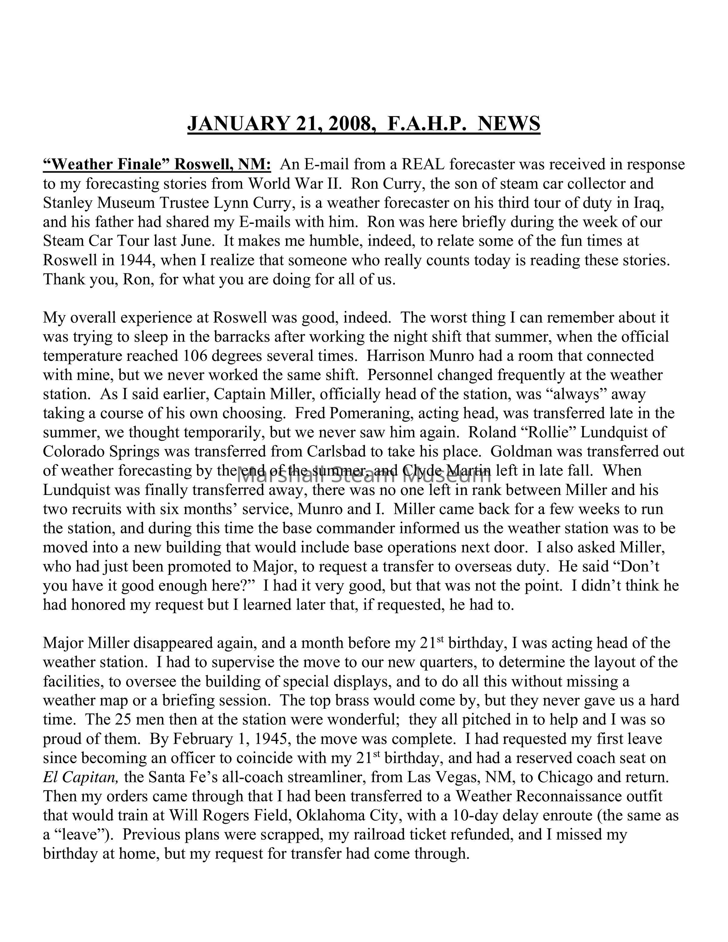 “Weather Finale” Roswell, NM: An E-mail from a REAL forecaster was received in response to my forecasting stories from World War II. Ron Curry, the son of steam car collector and Stanley Museum Trustee Lynn Curry, is a weather forecaster on his third tour of duty in Iraq, and his father had shared my E-mails with him. Ron was here briefly during the week of our Steam Car Tour last June. It makes me humble, indeed, to relate some of the fun times at Roswell in 1944, when I realize that someone who really counts today is reading these stories.