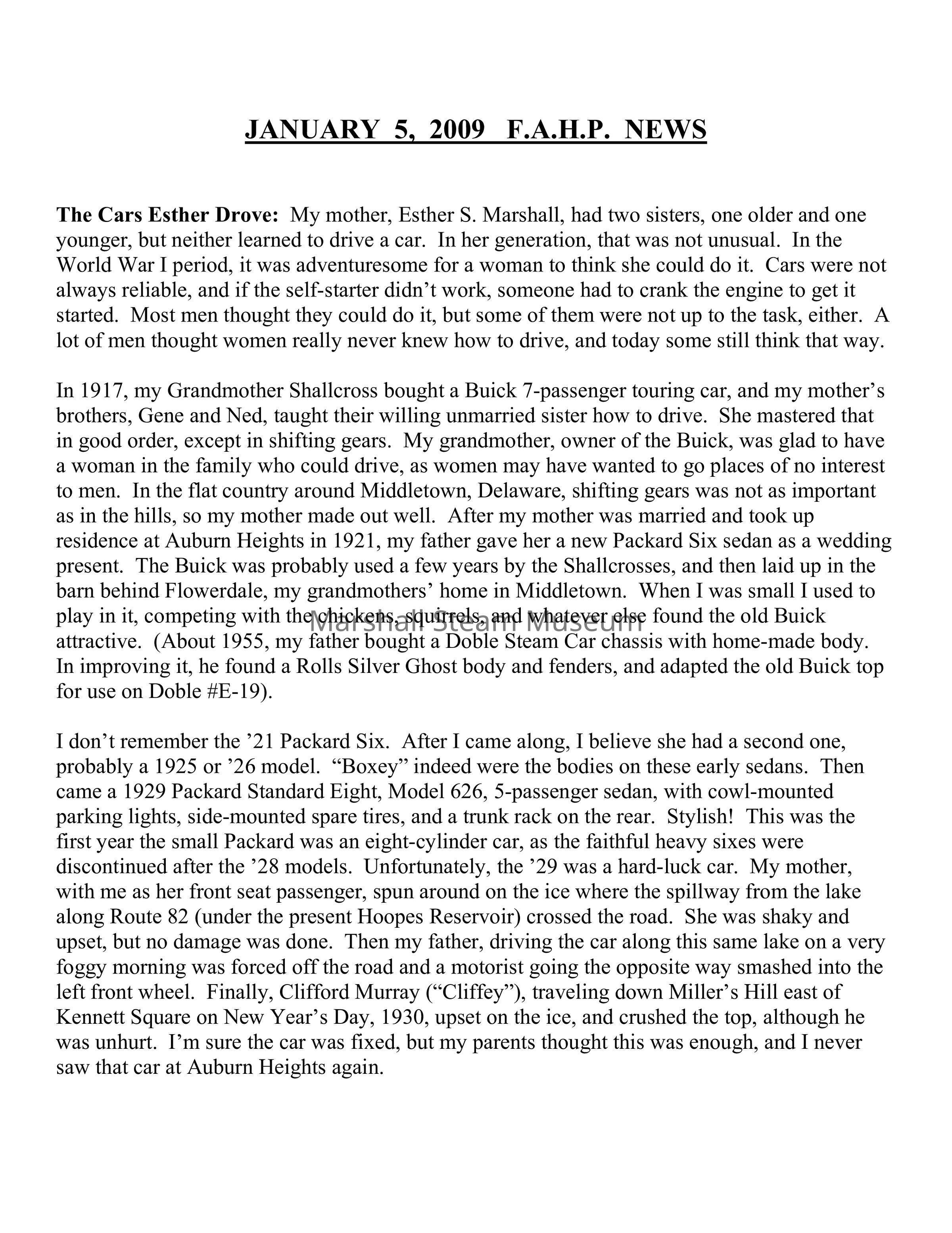 The Cars Esther Drove: My mother, Esther S. Marshall, had two sisters, one older and one younger, but neither learned to drive a car. In her generation, that was not unusual. In the World War I period, it was adventuresome for a woman to think she could do it. Cars were not always reliable, and if the self-starter didn’t work, someone had to crank the engine to get it started. Most men thought they could do it, but some of them were not up to the task, either. A lot of men thought women really never knew how to drive, and today some still think that way.