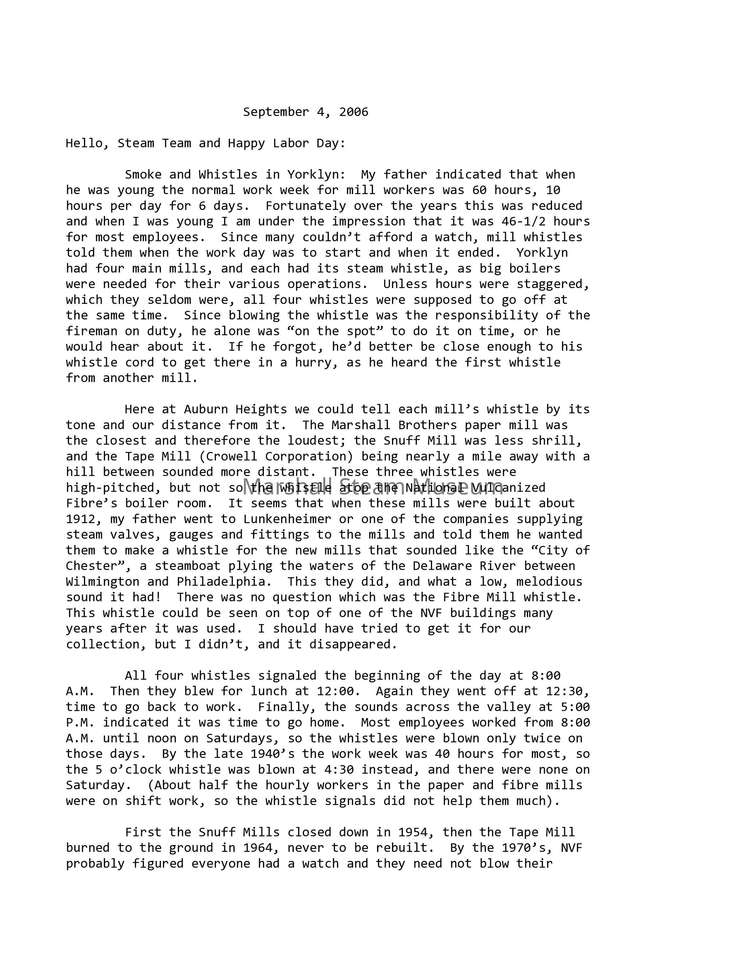 Smoke and Whistles in Yorklyn: My father indicated that when he was young the normal work week for mill workers was 60 hours, 10 hours per day for 6 days. Fortunately over the years this was reduced and when I was young I am under the impression that it was 46-1/2 hours for most employees. Since many couldn’t afford a watch, mill whistles told them when the work day was to start and when it ended. Yorklyn had four main mills, and each had its steam whistle, as big boilers were needed for their various operations. Unless hours were staggered, which they seldom were, all four whistles were supposed to go off at the same time. Since blowing the whistle was the responsibility of the fireman on duty, he alone was “on the spot” to do it on time, or he would hear about it. If he forgot, he’d better be close enough to his whistle cord to get there in a hurry, as he heard the first whistle from another mill.