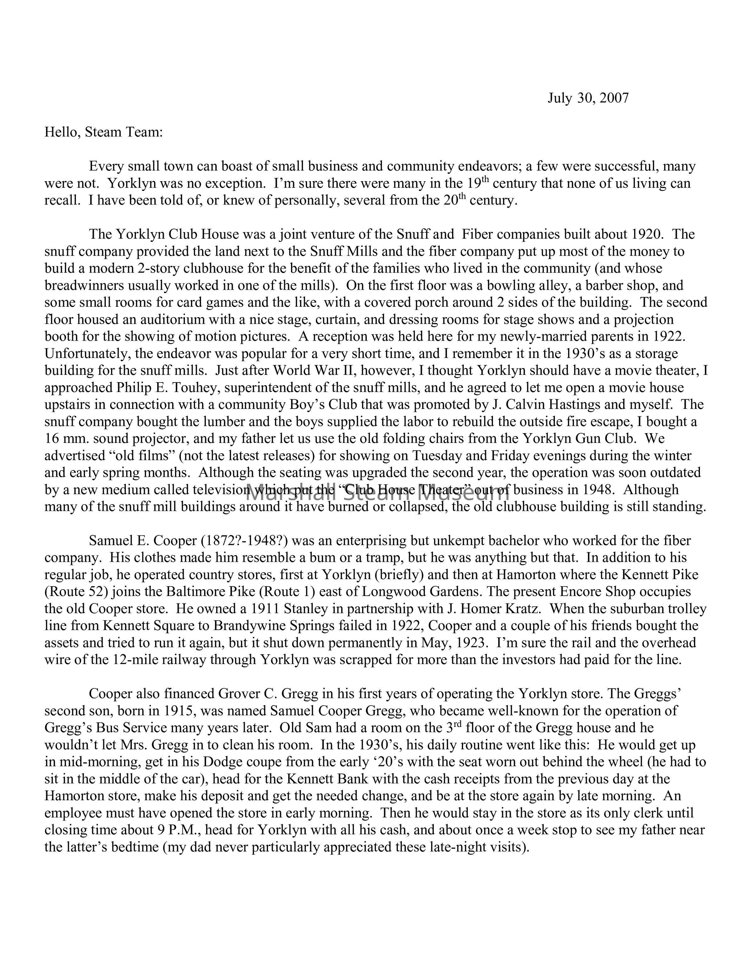 Cooper also financed Grover C. Gregg in his first years of operating the Yorklyn store. The Greggs’ second son, born in 1915, was named Samuel Cooper Gregg, who became well-known for the operation of Gregg’s Bus Service many years later. Old Sam had a room on the 3rd floor of the Gregg house and he wouldn’t let Mrs. Gregg in to clean his room. In the 1930’s, his daily routine went like this: He would get up in mid-morning, get in his Dodge coupe from the early ‘20’s with the seat worn out behind the wheel (he had to sit in the middle of the car), head for the Kennett Bank with the cash receipts from the previous day at the Hamorton store, make his deposit and get the needed change, and be at the store again by late morning. An employee must have opened the store in early morning. Then he would stay in the store as its only clerk until closing time about 9 P.M., head for Yorklyn with all his cash, and about once a week stop to see my father near the latter’s bedtime (my dad never particularly appreciated these late-night visits).