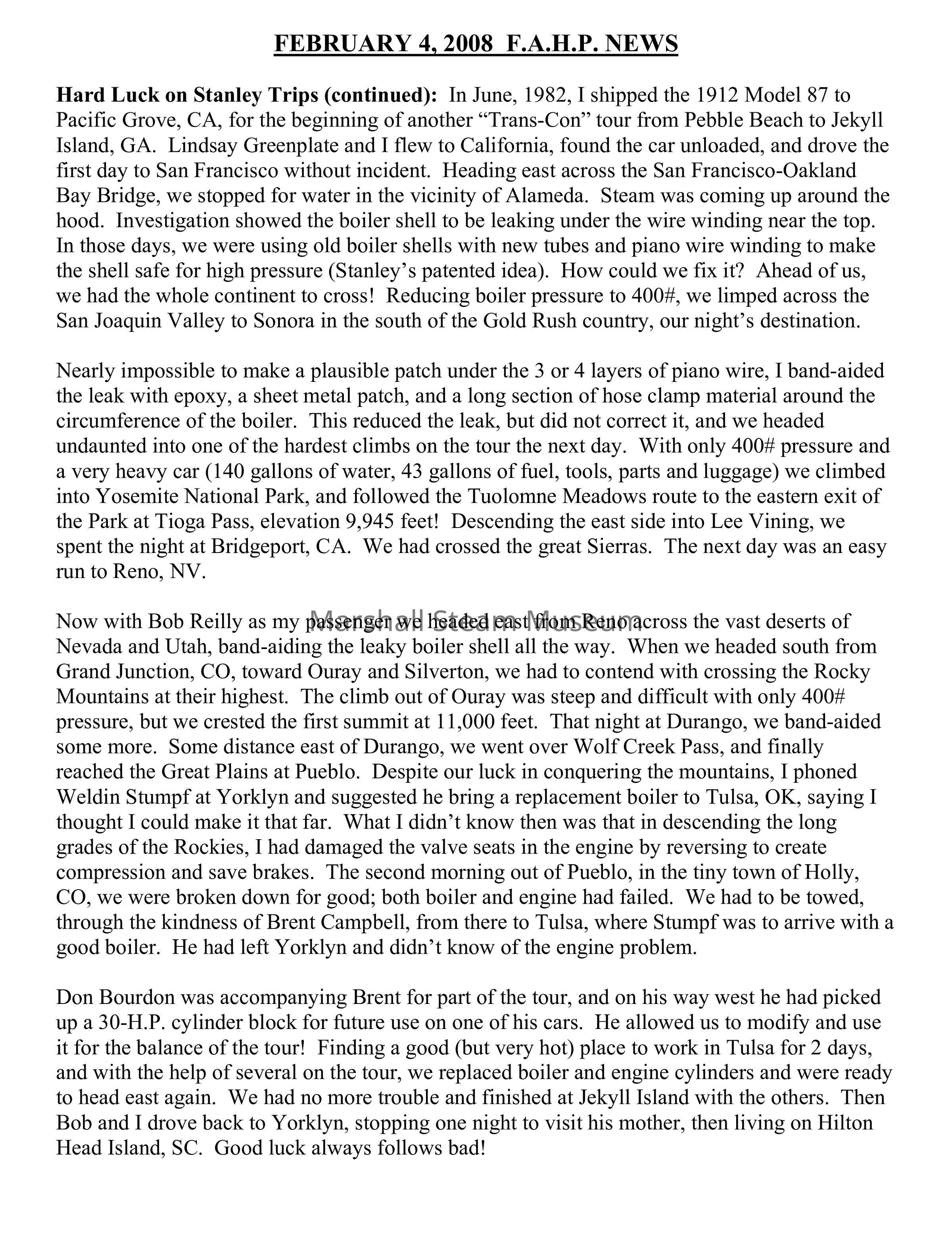 Hard Luck on Stanley Trips (continued): In June, 1982, I shipped the 1912 Model 87 to Pacific Grove, CA, for the beginning of another “Trans-Con” tour from Pebble Beach to Jekyll Island, GA. Lindsay Greenplate and I flew to California, found the car unloaded, and drove the first day to San Francisco without incident. Heading east across the San Francisco-Oakland Bay Bridge, we stopped for water in the vicinity of Alameda. Steam was coming up around the hood. Investigation showed the boiler shell to be leaking under the wire winding near the top. In those days, we were using old boiler shells with new tubes and piano wire winding to make the shell safe for high pressure (Stanley’s patented idea). How could we fix it? Ahead of us, we had the whole continent to cross! Reducing boiler pressure to 400#, we limped across the San Joaquin Valley to Sonora in the south of the Gold Rush country, our night’s destination.