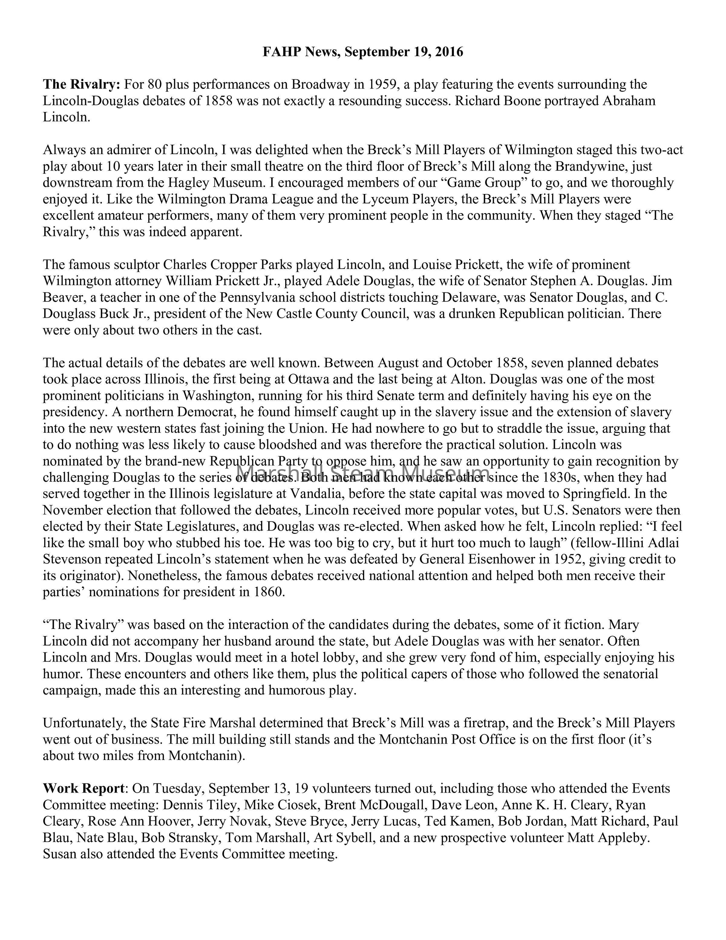 Always an admirer of Lincoln, I was delighted when the Breck’s Mill Players of Wilmington staged this two-act play about 10 years later in their small theatre on the third floor of Breck’s Mill along the Brandywine, just downstream from the Hagley Museum. I encouraged members of our “Game Group” to go, and we thoroughly enjoyed it. Like the Wilmington Drama League and the Lyceum Players, the Breck’s Mill Players were excellent amateur performers, many of them very prominent people in the community. When they staged “The Rivalry,” this was indeed apparent.