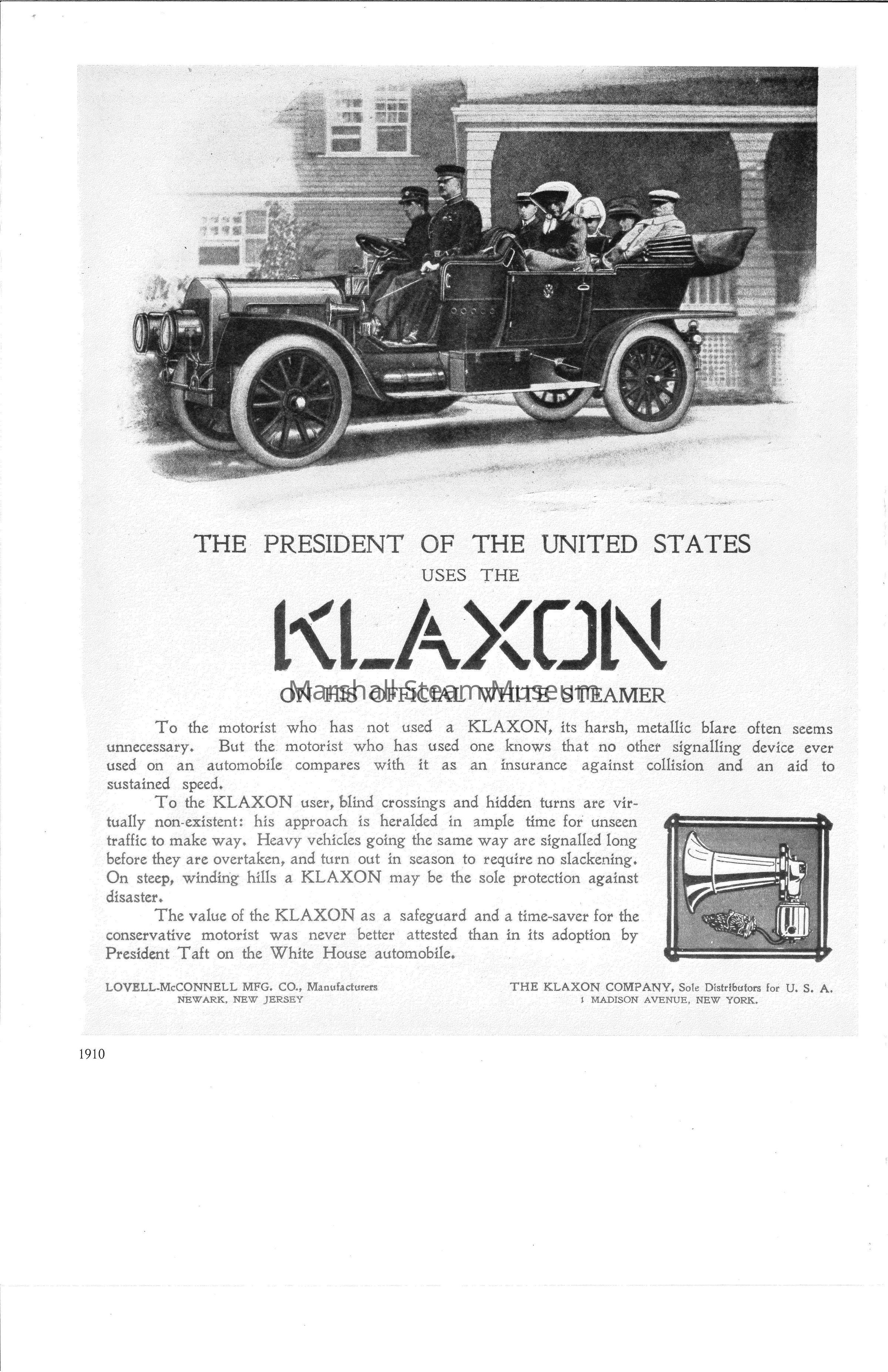 1910 advertisement for Klaxon horn scanned excerpt from "The Poster Book of Antique Auto Ads" by Howard Garrett