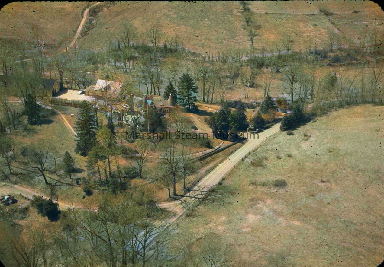 This image is of Auburn Heights as it was in the late 1950s and early 1960s. The Auburn Valley Railroad roadbed is present but rails and ties are yet to be laid. The original rock garden is visible where the pond resides today and the railroad tunnel would not appear for another ten years. This slide allowed the slide set to be dated to the March-April 1960 time period.Photograph Details