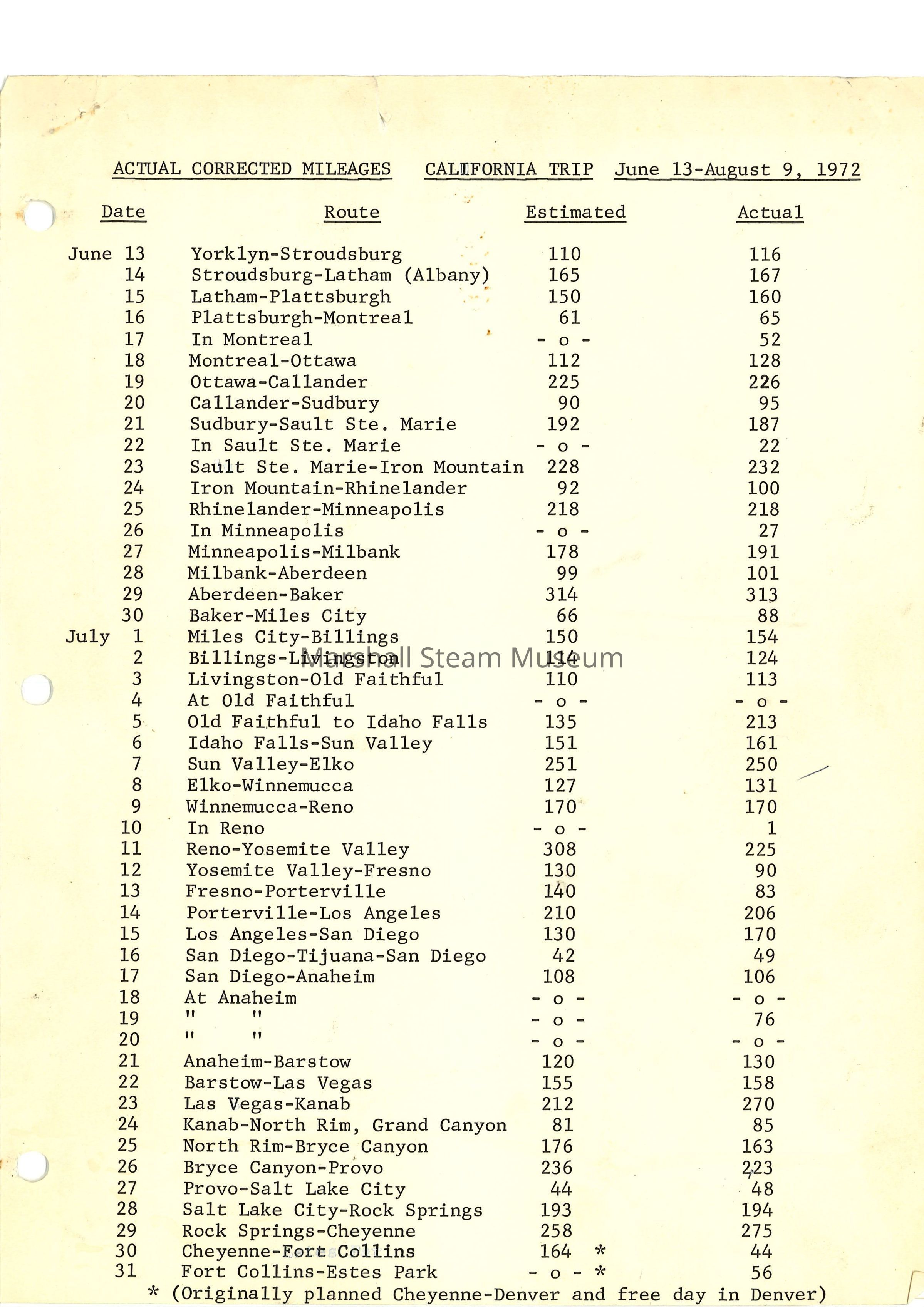 Statistics from the 1972 Tour including actual mileage, passengers and points of interest