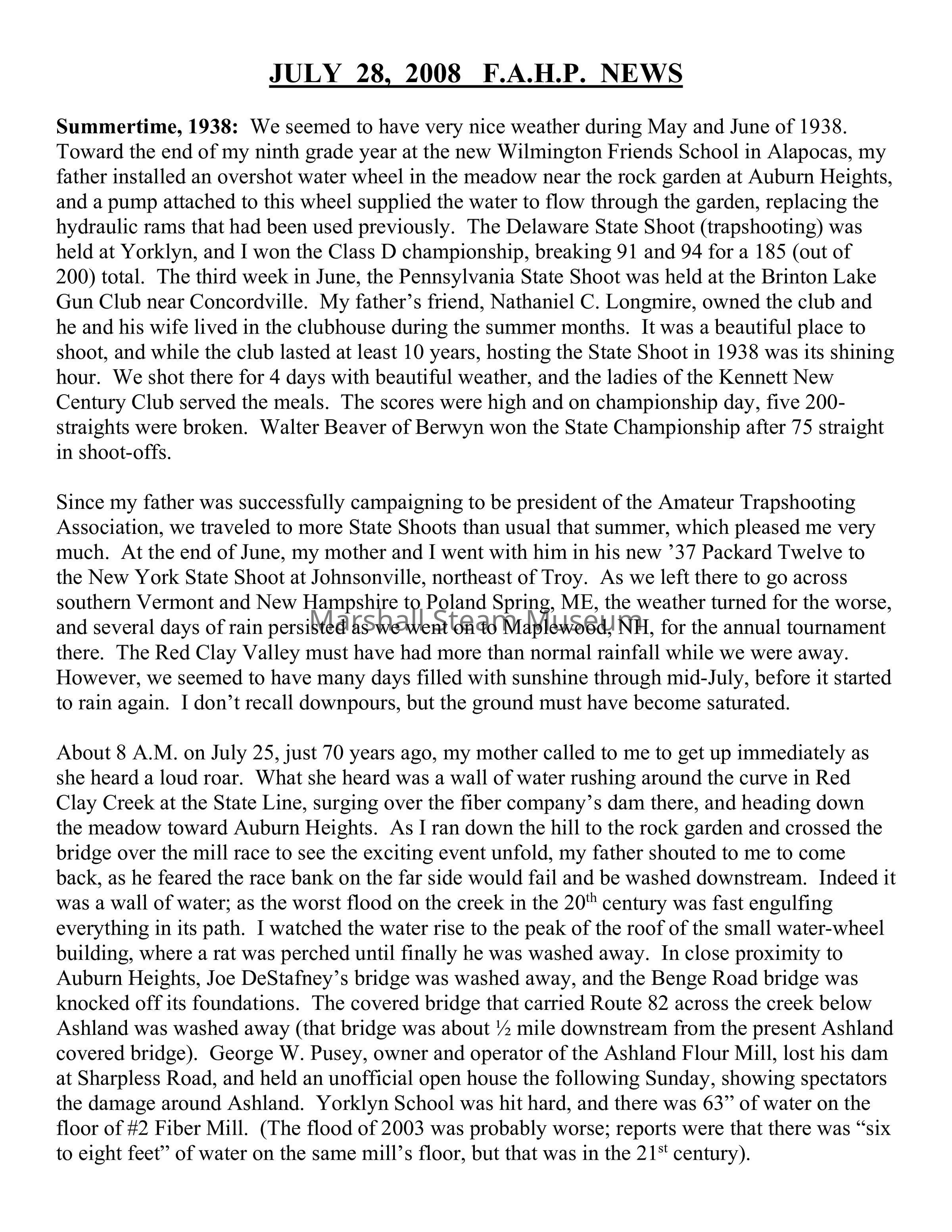 Since my father was successfully campaigning to be president of the Amateur Trapshooting Association, we traveled to more State Shoots than usual that summer, which pleased me very much. At the end of June, my mother and I went with him in his new ’37 Packard Twelve to the New York State Shoot at Johnsonville, northeast of Troy. As we left there to go across southern Vermont and New Hampshire to Poland Spring, ME, the weather turned for the worse, and several days of rain persisted as we went on to Maplewood, NH, for the annual tournament there. The Red Clay Valley must have had more than normal rainfall while we were away. However, we seemed to have many days filled with sunshine through mid-July, before it started to rain again. I don’t recall downpours, but the ground must have become saturated.