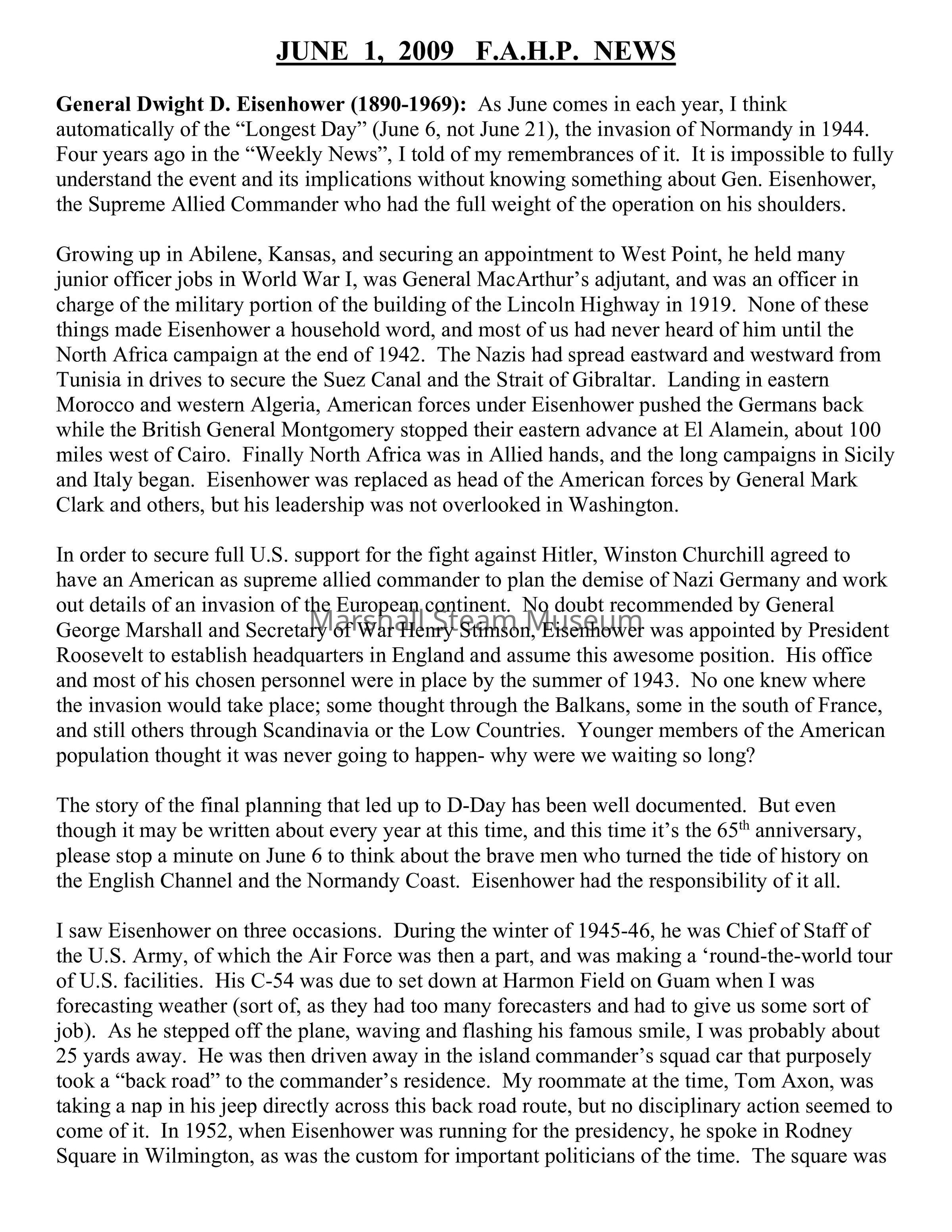 General Dwight D. Eisenhower (1890-1969): As June comes in each year, I think automatically of the “Longest Day” (June 6, not June 21), the invasion of Normandy in 1944. Four years ago in the “Weekly News”, I told of my remembrances of it. It is impossible to fully understand the event and its implications without knowing something about Gen. Eisenhower, the Supreme Allied Commander who had the full weight of the operation on his shoulders.