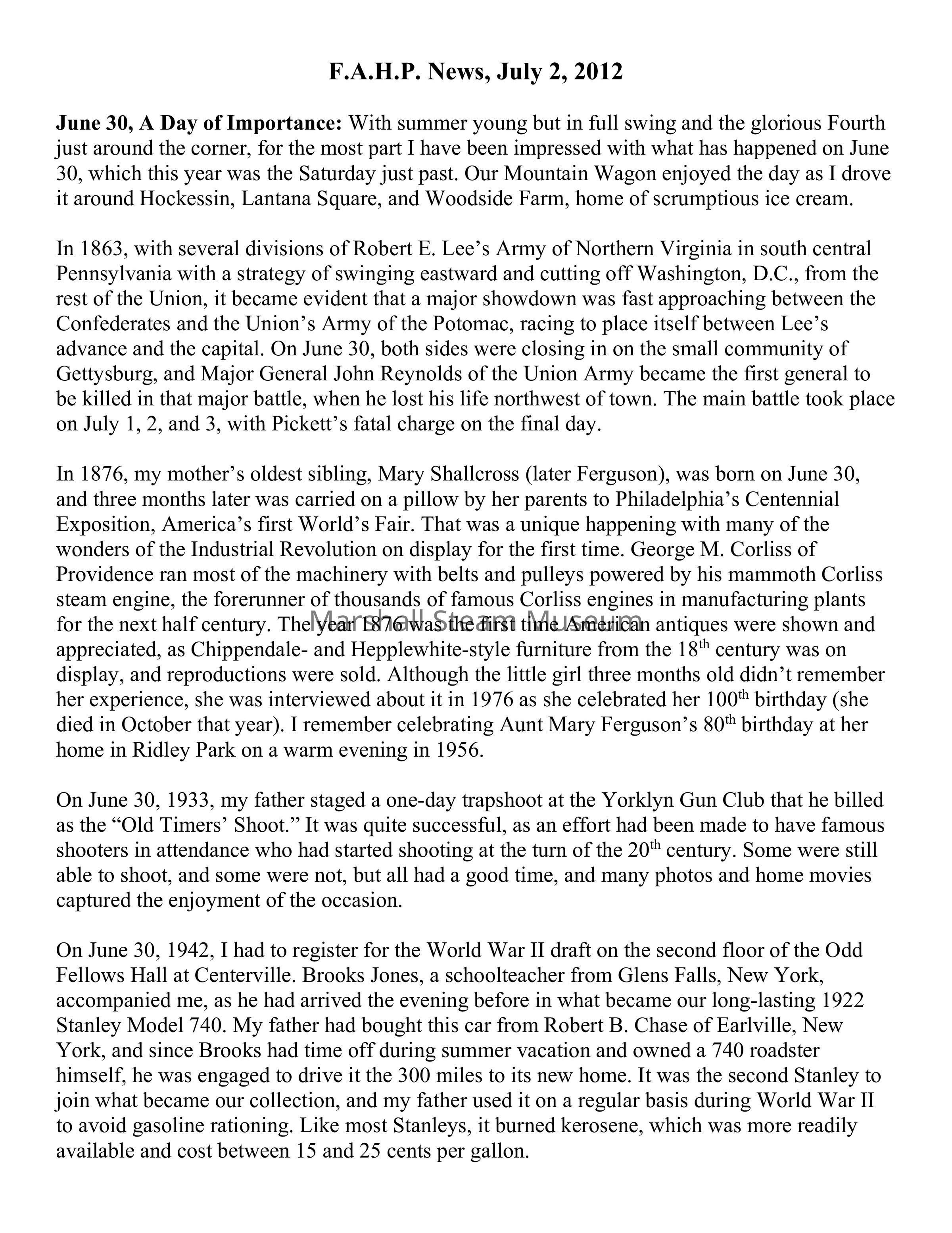 June 30, A Day of Importance: With summer young but in full swing and the glorious Fourth just around the corner, for the most part I have been impressed with what has happened on June 30, which this year was the Saturday just past. Our Mountain Wagon enjoyed the day as I drove it around Hockessin, Lantana Square, and Woodside Farm, home of scrumptious ice cream.