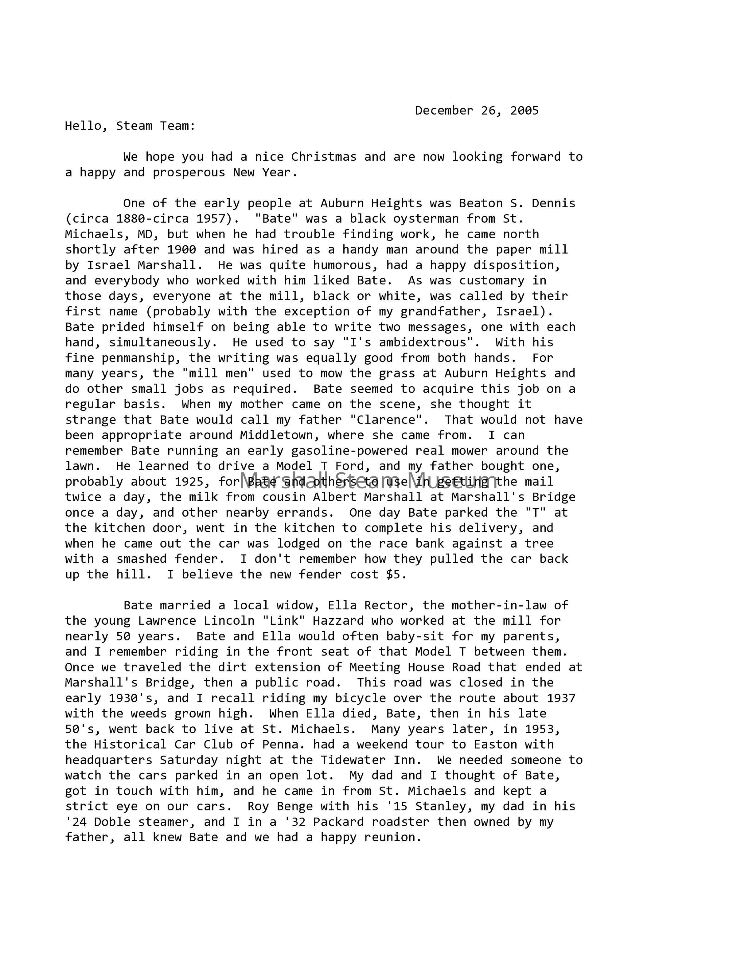 One of the early people at Auburn Heights was Beaton S. Dennis (circa 1880-circa 1957). "Bate" was a black oysterman from St. Michaels, MD, but when he had trouble finding work, he came north shortly after 1900 and was hired as a handy man around the paper mill by Israel Marshall. He was quite humorous, had a happy disposition, and everybody who worked with him liked Bate. As was customary in those days, everyone at the mill, black or white, was called by their first name (probably with the exception of my grandfather, Israel). Bate prided himself on being able to write two messages, one with each hand, simultaneously. He used to say "I's ambidextrous". With his fine penmanship, the writing was equally good from both hands. For many years, the "mill men" used to mow the grass at Auburn Heights and do other small jobs as required. Bate seemed to acquire this job on a regular basis. When my mother came on the scene, she thought it strange that Bate would call my father "Clarence". That would not have been appropriate around Middletown, where she came from. I can remember Bate running an early gasoline-powered real mower around the lawn. He learned to drive a Model T Ford, and my father bought one, probably about 1925, for Bate and others to use in getting the mail twice a day, the milk from cousin Albert Marshall at Marshall's Bridge once a day, and other nearby errands. One day Bate parked the "T" at the kitchen door, went in the kitchen to complete his delivery, and when he came out the car was lodged on the race bank against a tree with a smashed fender. I don't remember how they pulled the car back up the hill. I believe the new fender cost $5.