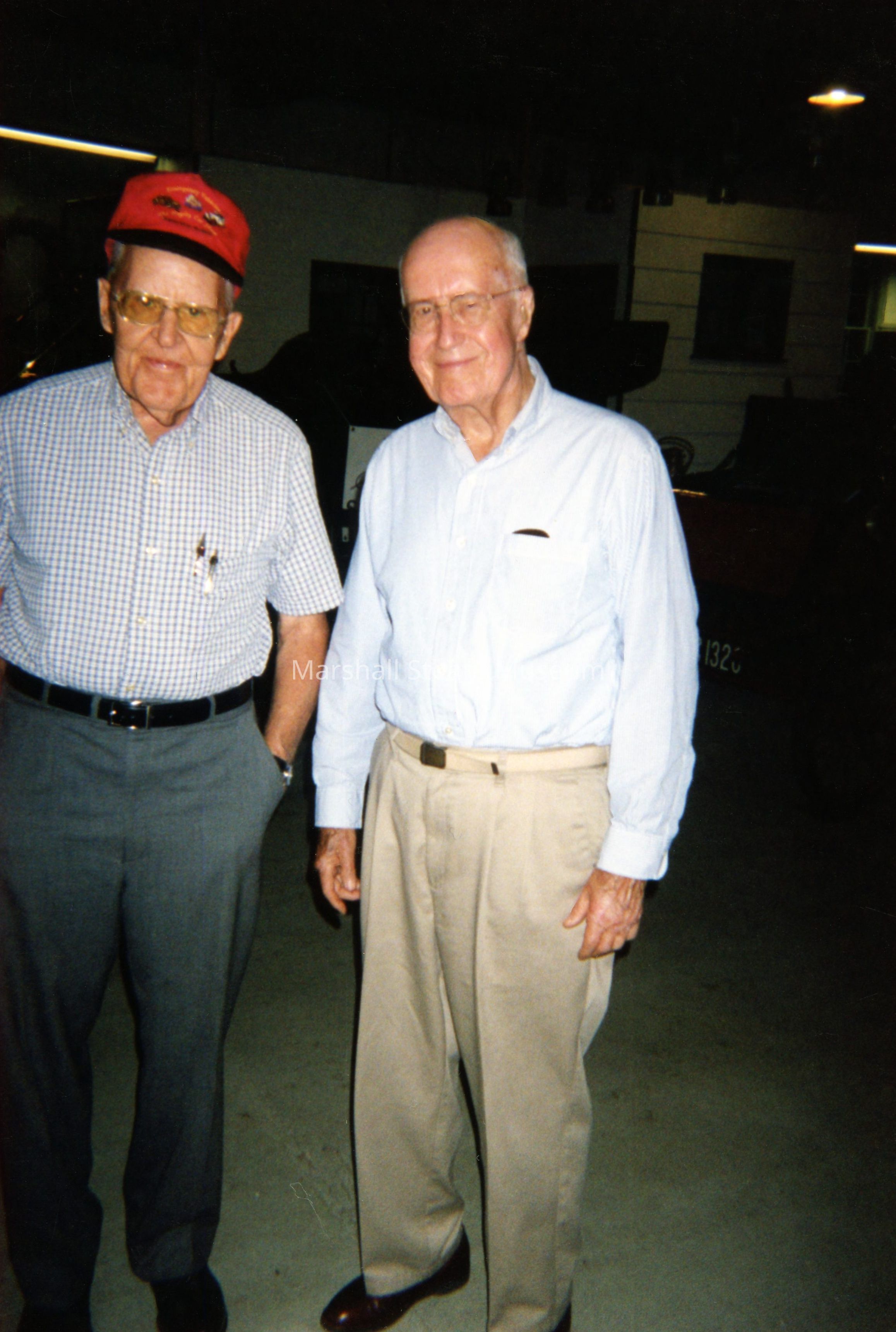Tom Marshall and Jim Weidenhammer at a Steam Team work session. Jim was the owner of White Steam Cars and was attending to explain the workings of early White cars.Photograph Details