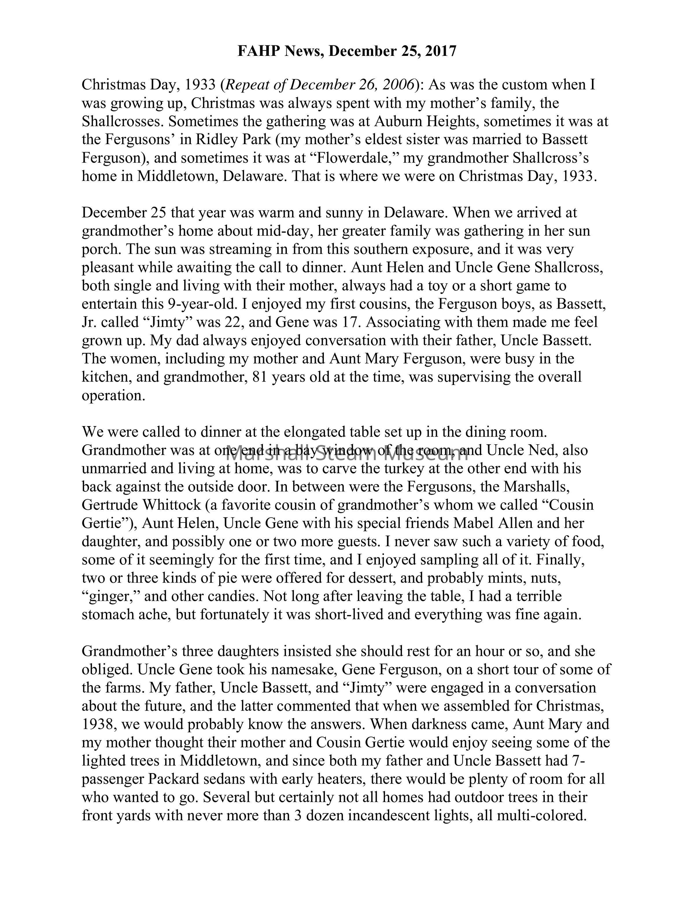 Christmas Day, 1933 (Repeat of December 26, 2006): As was the custom when I was growing up, Christmas was always spent with my mother’s family, the Shallcrosses. Sometimes the gathering was at Auburn Heights, sometimes it was at the Fergusons’ in Ridley Park (my mother’s eldest sister was married to Bassett Ferguson), and sometimes it was at “Flowerdale,” my grandmother Shallcross’s home in Middletown, Delaware. That is where we were on Christmas Day, 1933.