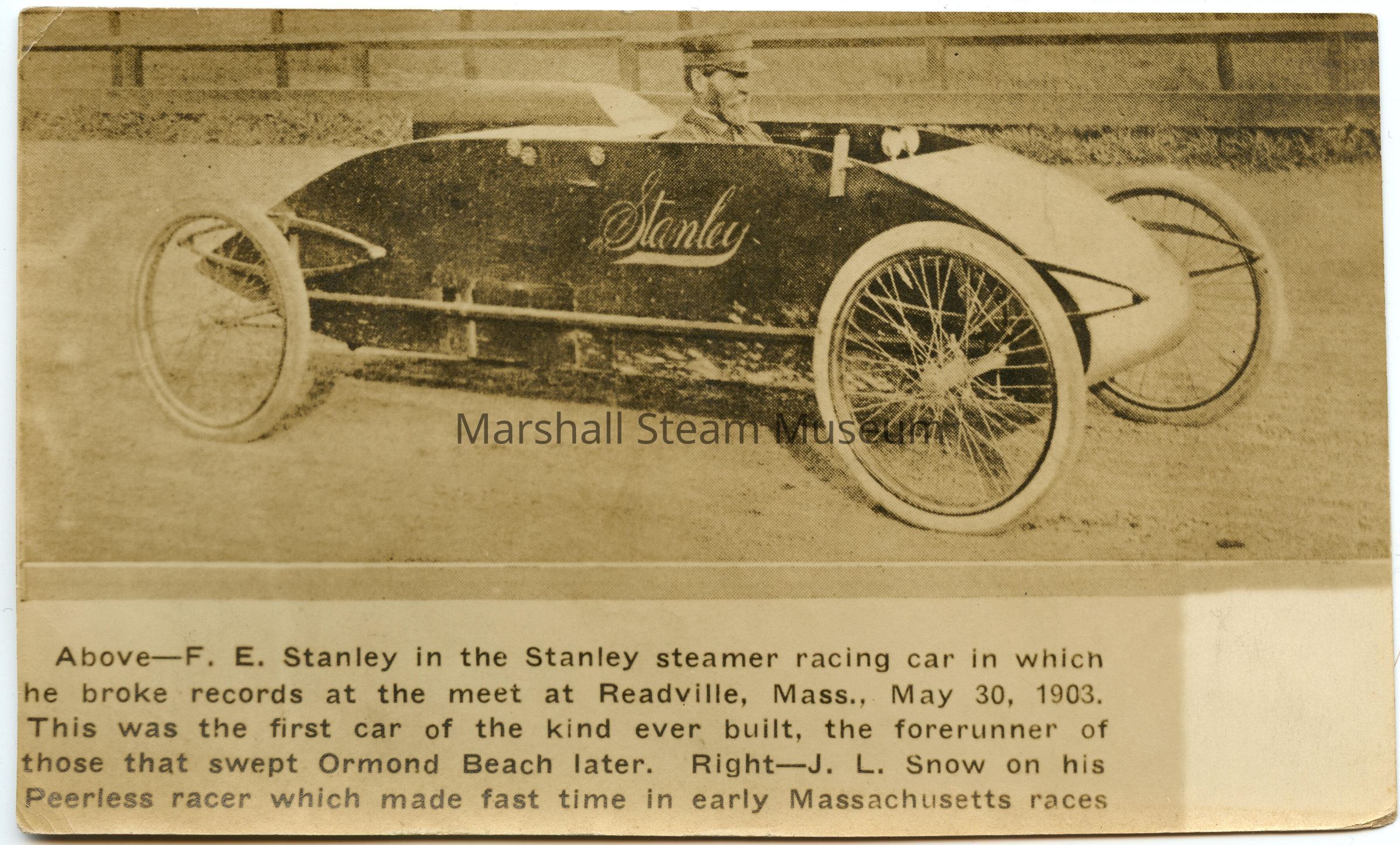 Image description: "Above--F. E. Stanley in the Stanley steamer racing car in which he broke records at the meet at Readville, Mass., May 30, 1903. This was the first car of the kind built, the forerunner of those that swept Ormond Beach later. Right-- J. L. Snow on his Peerless racer which made fast time in early Massachusetts races."Made/Created