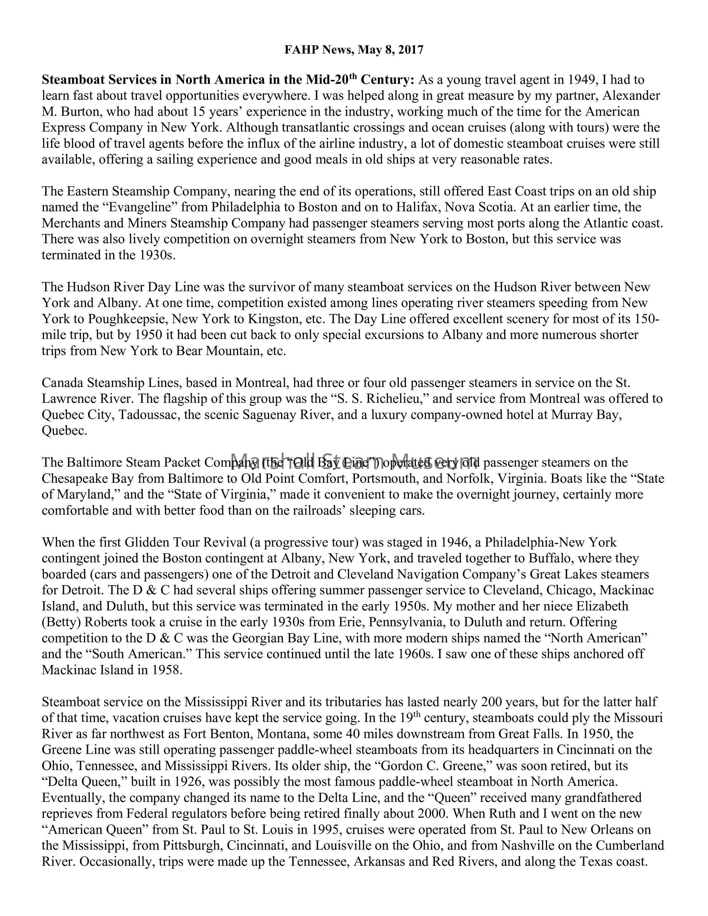 Steamboat Services in North America in the Mid-20th Century: As a young travel agent in 1949, I had to learn fast about travel opportunities everywhere. I was helped along in great measure by my partner, Alexander M. Burton, who had about 15 years’ experience in the industry, working much of the time for the American Express Company in New York. Although transatlantic crossings and ocean cruises (along with tours) were the life blood of travel agents before the influx of the airline industry, a lot of domestic steamboat cruises were still available, offering a sailing experience and good meals in old ships at very reasonable rates.
