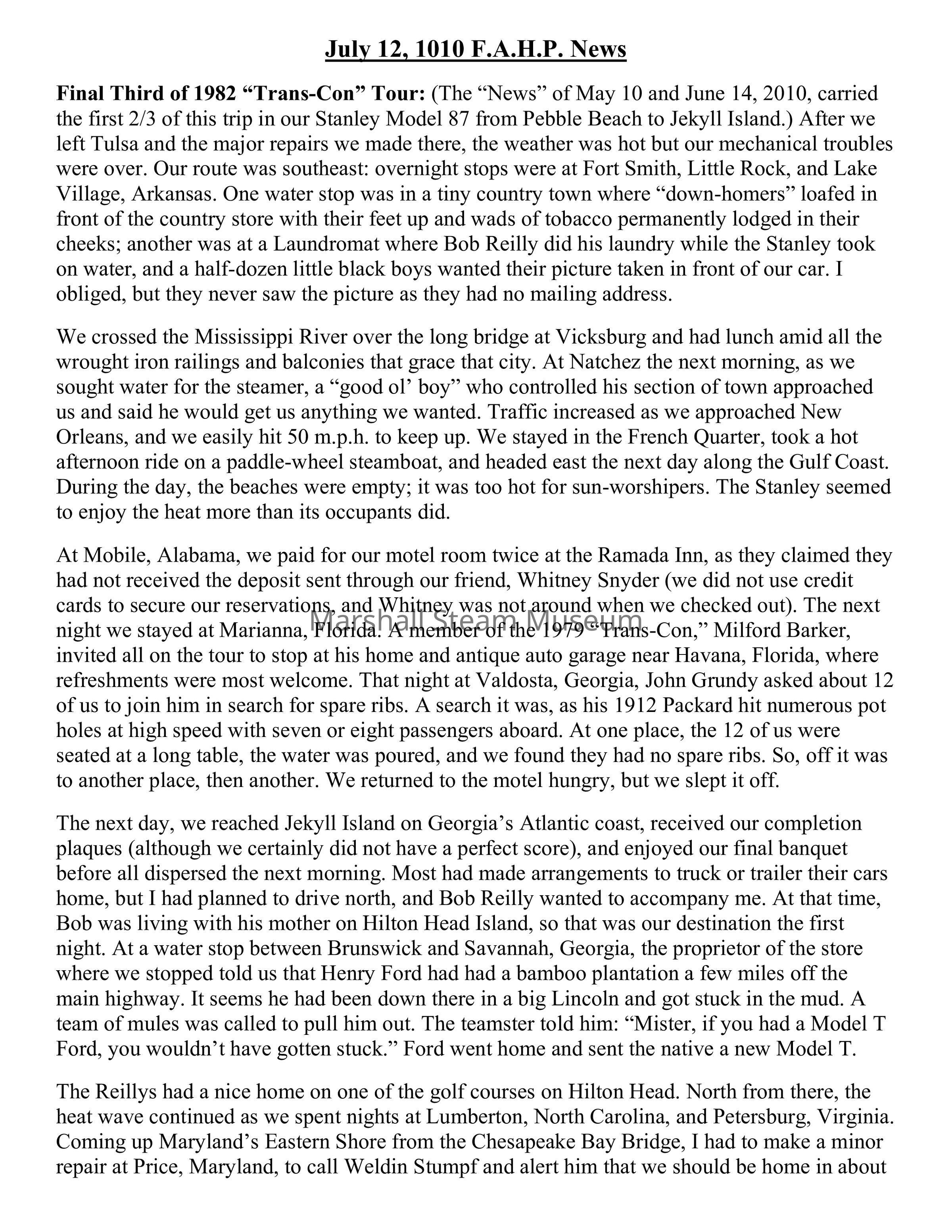 Final Third of 1982 “Trans-Con” Tour: (The “News” of May 10 and June 14, 2010, carried the first 2/3 of this trip in our Stanley Model 87 from Pebble Beach to Jekyll Island.) After we left Tulsa and the major repairs we made there, the weather was hot but our mechanical troubles were over. Our route was southeast: overnight stops were at Fort Smith, Little Rock, and Lake Village, Arkansas. One water stop was in a tiny country town where “down-homers” loafed in front of the country store with their feet up and wads of tobacco permanently lodged in their cheeks; another was at a Laundromat where Bob Reilly did his laundry while the Stanley took on water, and a half-dozen little black boys wanted their picture taken in front of our car. I obliged, but they never saw the picture as they had no mailing address.