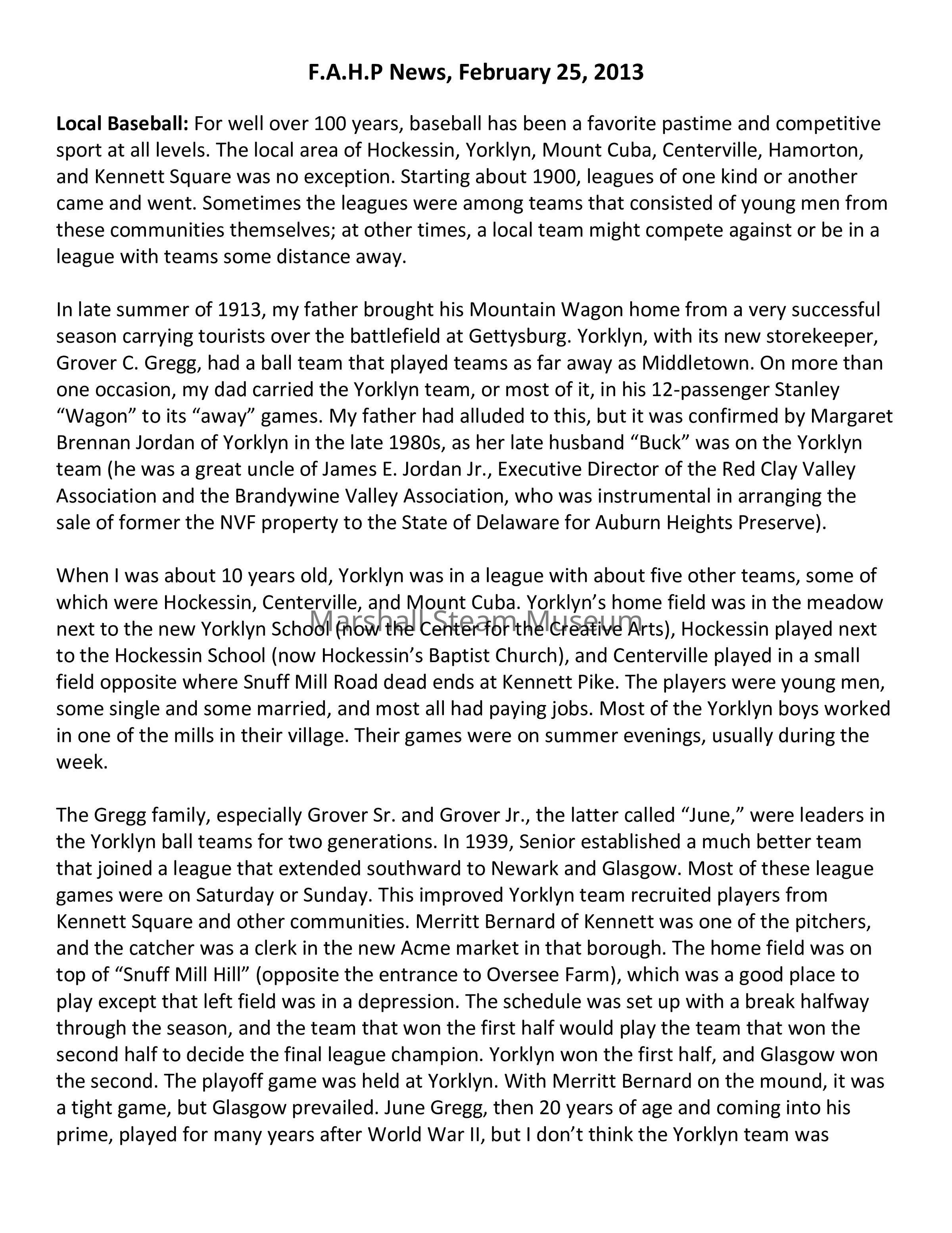 In late summer of 1913, my father brought his Mountain Wagon home from a very successful season carrying tourists over the battlefield at Gettysburg. Yorklyn, with its new storekeeper, Grover C. Gregg, had a ball team that played teams as far away as Middletown. On more than one occasion, my dad carried the Yorklyn team, or most of it, in his 12-passenger Stanley “Wagon” to its “away” games. My father had alluded to this, but it was confirmed by Margaret Brennan Jordan of Yorklyn in the late 1980s, as her late husband “Buck” was on the Yorklyn team (he was a great uncle of James E. Jordan Jr., Executive Director of the Red Clay Valley Association and the Brandywine Valley Association, who was instrumental in arranging the sale of former the NVF property to the State of Delaware for Auburn Heights Preserve).
