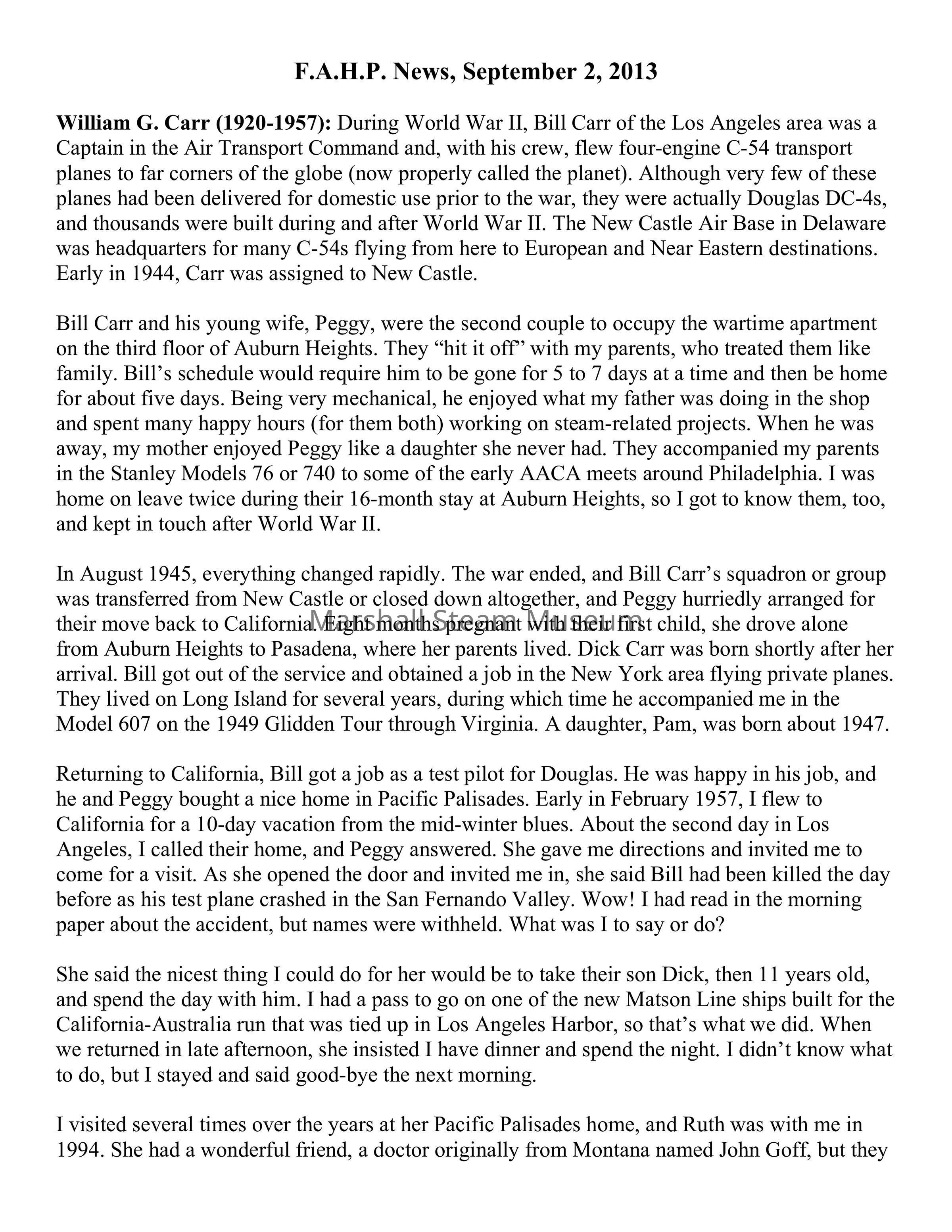 Bill Carr and his young wife, Peggy, were the second couple to occupy the wartime apartment on the third floor of Auburn Heights. They “hit it off” with my parents, who treated them like family. Bill’s schedule would require him to be gone for 5 to 7 days at a time and then be home for about five days. Being very mechanical, he enjoyed what my father was doing in the shop and spent many happy hours (for them both) working on steam-related projects. When he was away, my mother enjoyed Peggy like a daughter she never had. They accompanied my parents in the Stanley Models 76 or 740 to some of the early AACA meets around Philadelphia. I was home on leave twice during their 16-month stay at Auburn Heights, so I got to know them, too, and kept in touch after World War II.