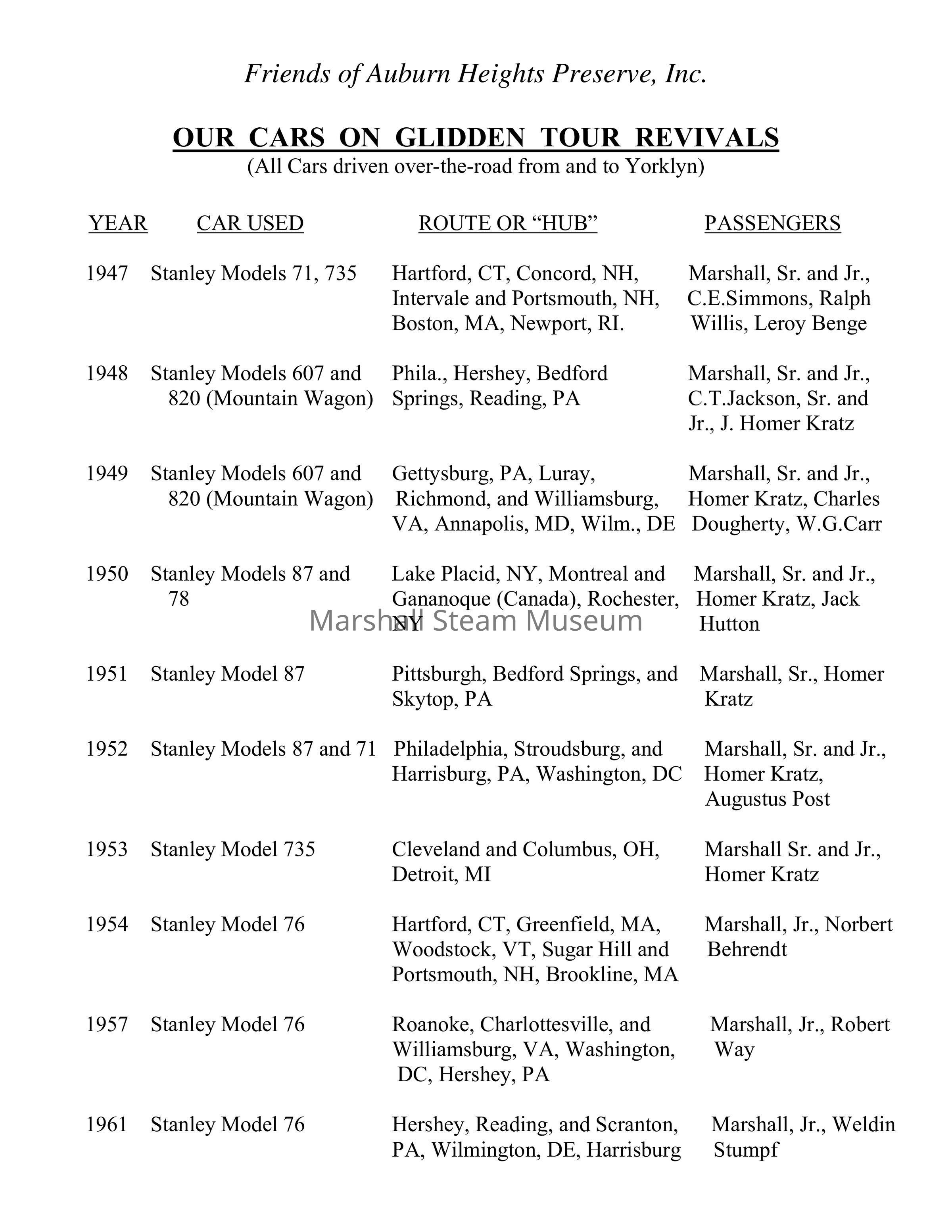 List of Marshall steam car participation in 1947 - 1984 Glidden Tours