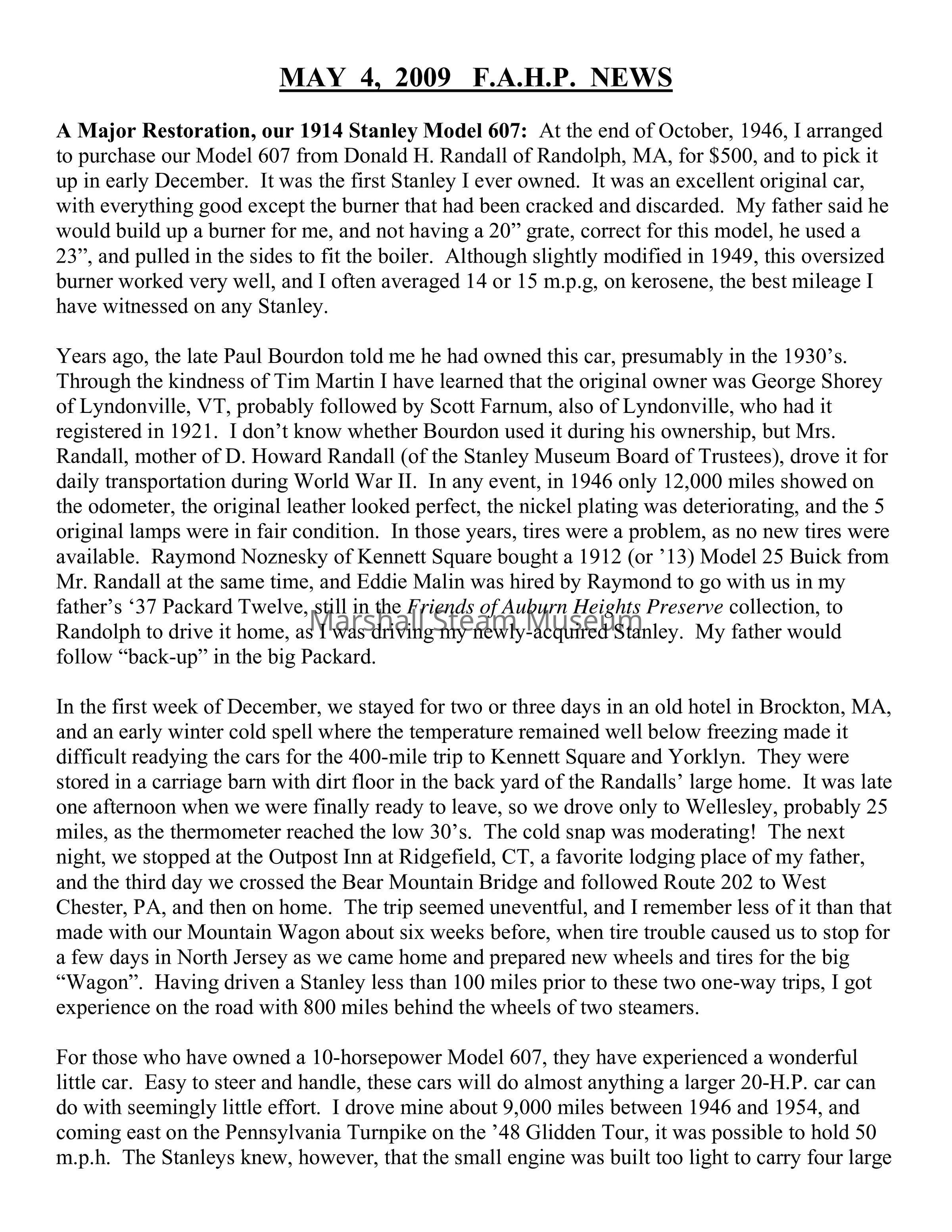 A Major Restoration, our 1914 Stanley Model 607: At the end of October, 1946, I arranged to purchase our Model 607 from Donald H. Randall of Randolph, MA, for $500, and to pick it up in early December. It was the first Stanley I ever owned. It was an excellent original car, with everything good except the burner that had been cracked and discarded. My father said he would build up a burner for me, and not having a 20” grate, correct for this model, he used a 23”, and pulled in the sides to fit the boiler. Although slightly modified in 1949, this oversized burner worked very well, and I often averaged 14 or 15 m.p.g, on kerosene, the best mileage I have witnessed on any Stanley.