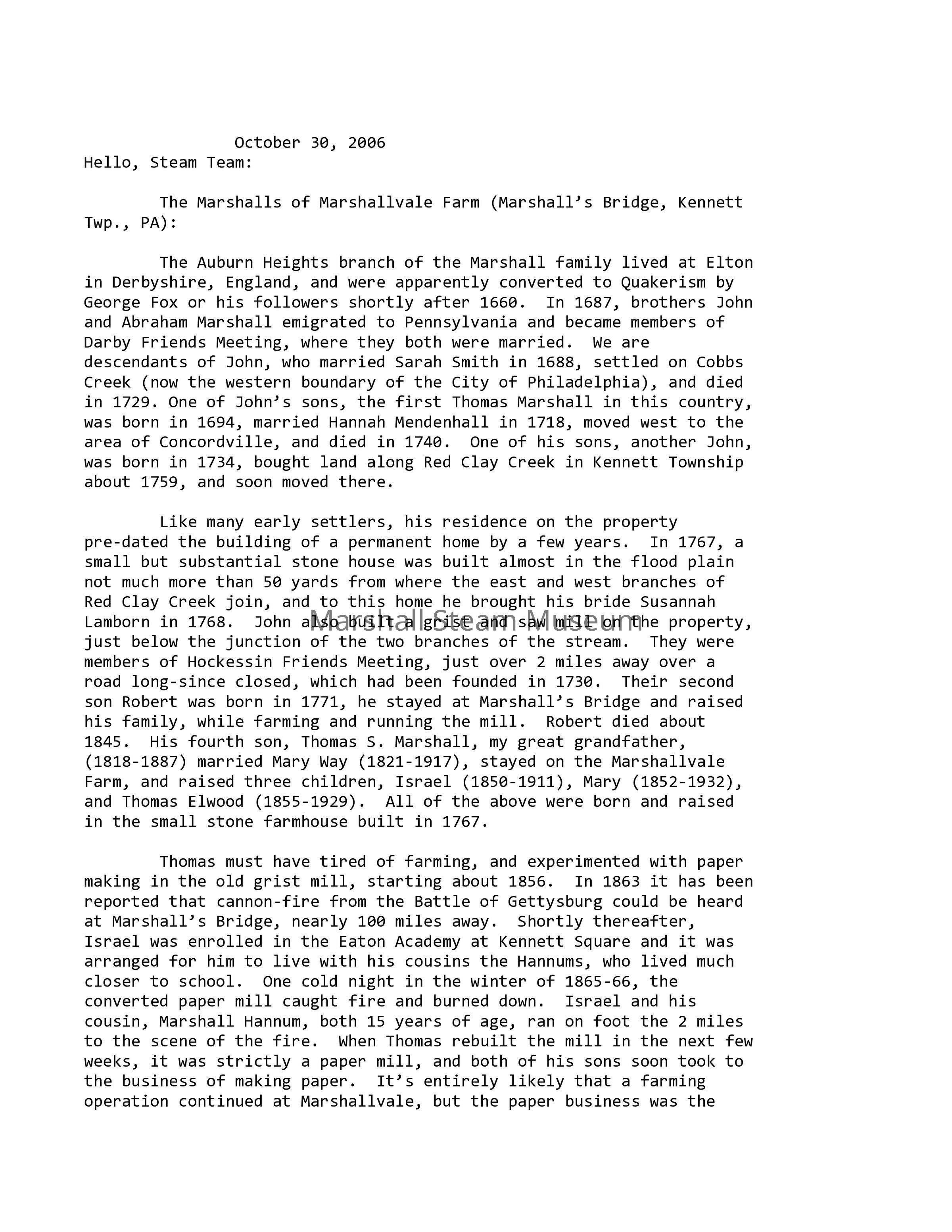 The Marshalls of Marshallvale Farm (Marshall’s Bridge, Kennett Twp., PA):