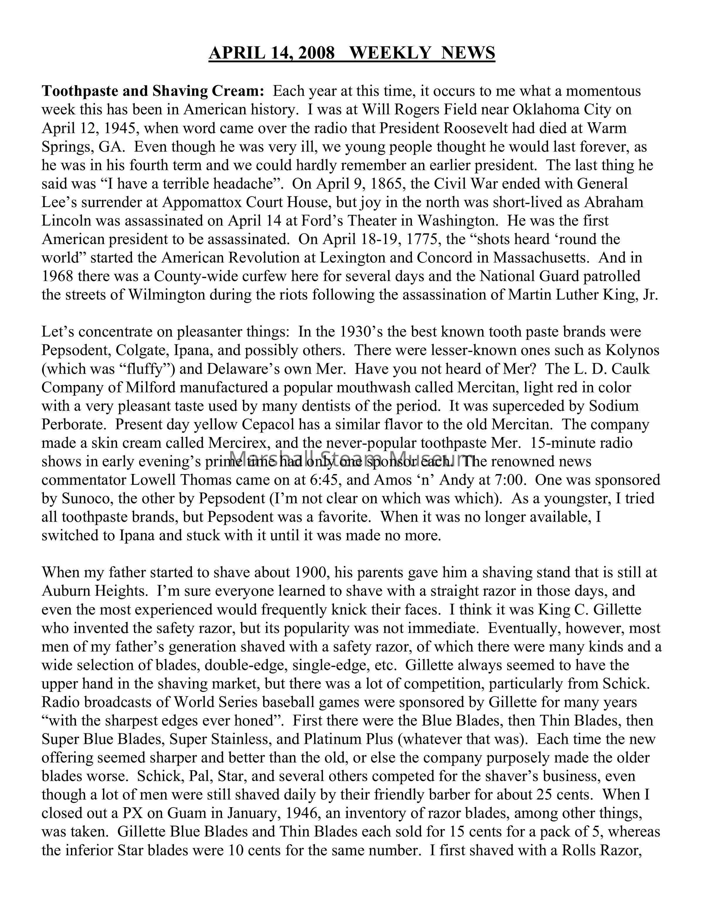 Toothpaste and Shaving Cream: Each year at this time, it occurs to me what a momentous week this has been in American history. I was at Will Rogers Field near Oklahoma City on April 12, 1945, when word came over the radio that President Roosevelt had died at Warm Springs, GA. Even though he was very ill, we young people thought he would last forever, as he was in his fourth term and we could hardly remember an earlier president. The last thing he said was “I have a terrible headache”. On April 9, 1865, the Civil War ended with General Lee’s surrender at Appomattox Court House, but joy in the north was short-lived as Abraham Lincoln was assassinated on April 14 at Ford’s Theater in Washington. He was the first American president to be assassinated. On April 18-19, 1775, the “shots heard ‘round the world” started the American Revolution at Lexington and Concord in Massachusetts. And in 1968 there was a County-wide curfew here for several days and the National Guard patrolled the streets of Wilmington during the riots following the assassination of Martin Luther King, Jr.