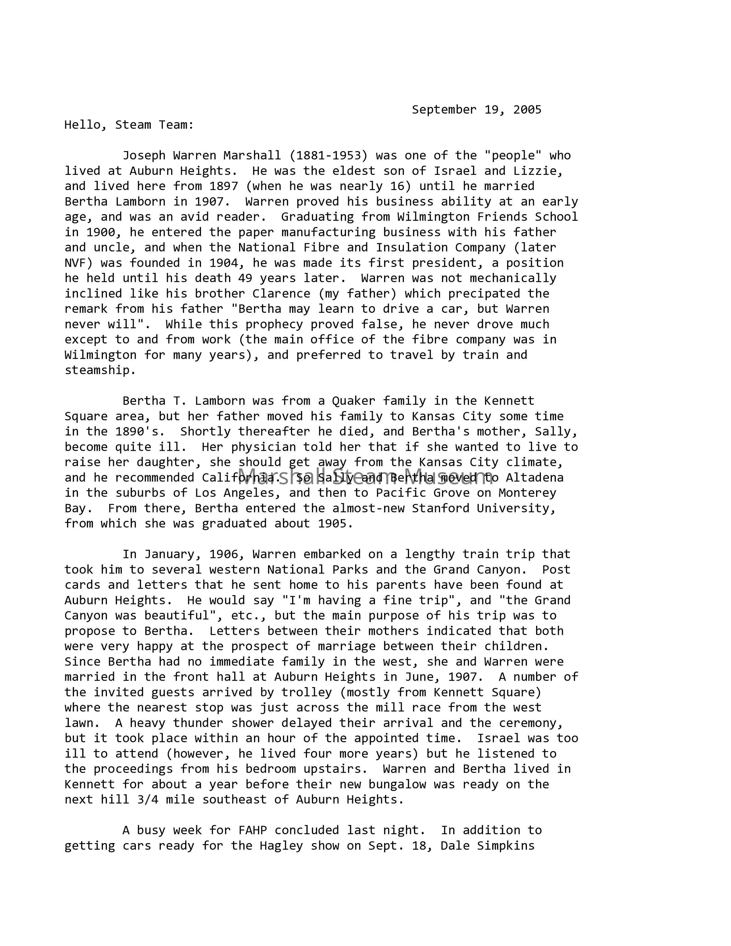 In January, 1906, Warren embarked on a lengthy train trip that took him to several western National Parks and the Grand Canyon. Post cards and letters that he sent home to his parents have been found at Auburn Heights. He would say "I'm having a fine trip", and "the Grand Canyon was beautiful", etc., but the main purpose of his trip was to propose to Bertha. Letters between their mothers indicated that both were very happy at the prospect of marriage between their children. Since Bertha had no immediate family in the west, she and Warren were married in the front hall at Auburn Heights in June, 1907. A number of the invited guests arrived by trolley (mostly from Kennett Square) where the nearest stop was just across the mill race from the west lawn. A heavy thunder shower delayed their arrival and the ceremony, but it took place within an hour of the appointed time. Israel was too ill to attend (however, he lived four more years) but he listened to the proceedings from his bedroom upstairs. Warren and Bertha lived in Kennett for about a year before their new bungalow was ready on the next hill 3/4 mile southeast of Auburn Heights.