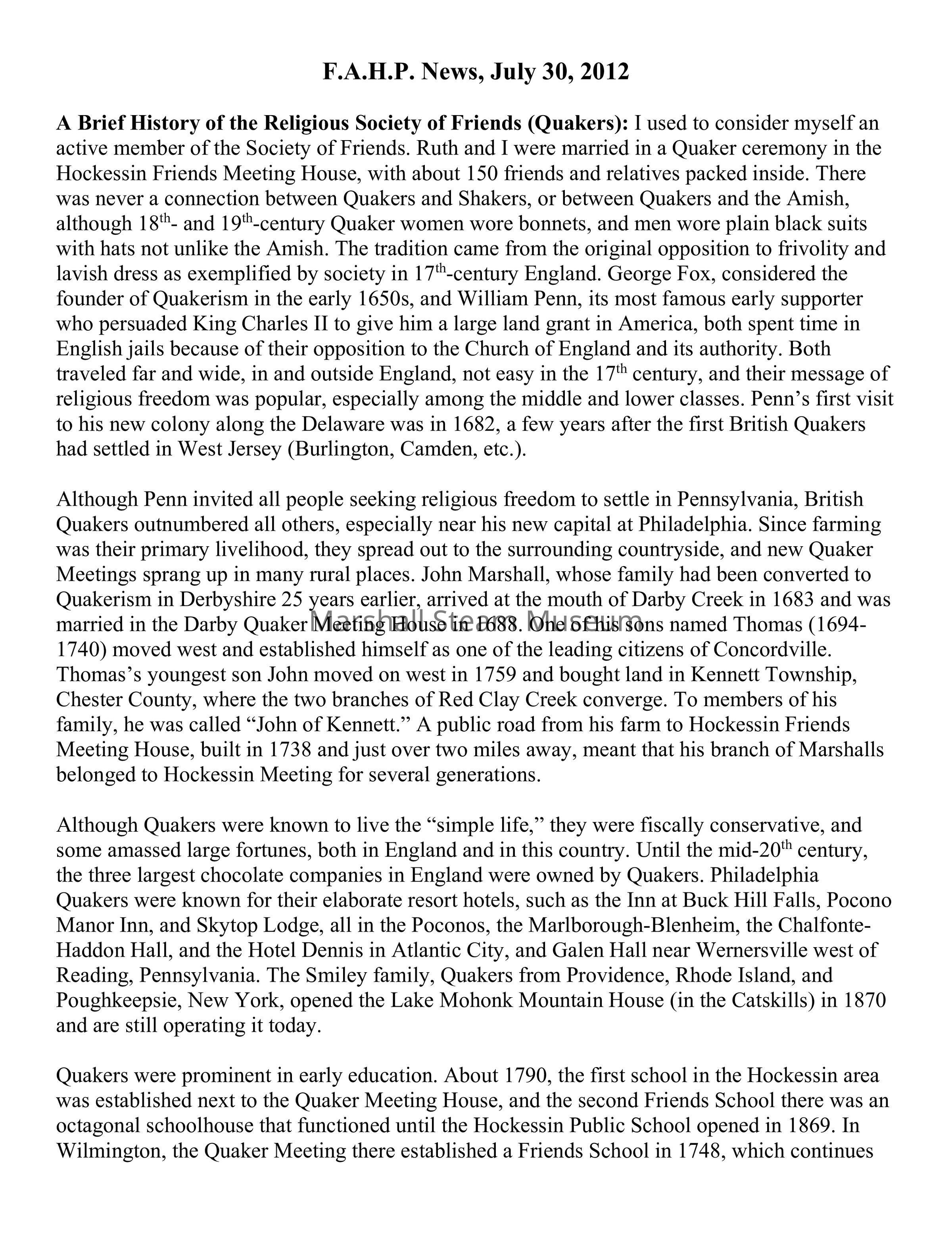 A Brief History of the Religious Society of Friends (Quakers): I used to consider myself an active member of the Society of Friends. Ruth and I were married in a Quaker ceremony in the Hockessin Friends Meeting House, with about 150 friends and relatives packed inside. There was never a connection between Quakers and Shakers, or between Quakers and the Amish, although 18th- and 19th-century Quaker women wore bonnets, and men wore plain black suits with hats not unlike the Amish. The tradition came from the original opposition to frivolity and lavish dress as exemplified by society in 17th-century England. George Fox, considered the founder of Quakerism in the early 1650s, and William Penn, its most famous early supporter who persuaded King Charles II to give him a large land grant in America, both spent time in English jails because of their opposition to the Church of England and its authority. Both traveled far and wide, in and outside England, not easy in the 17th century, and their message of religious freedom was popular, especially among the middle and lower classes. Penn’s first visit to his new colony along the Delaware was in 1682, a few years after the first British Quakers had settled in West Jersey (Burlington, Camden, etc.).