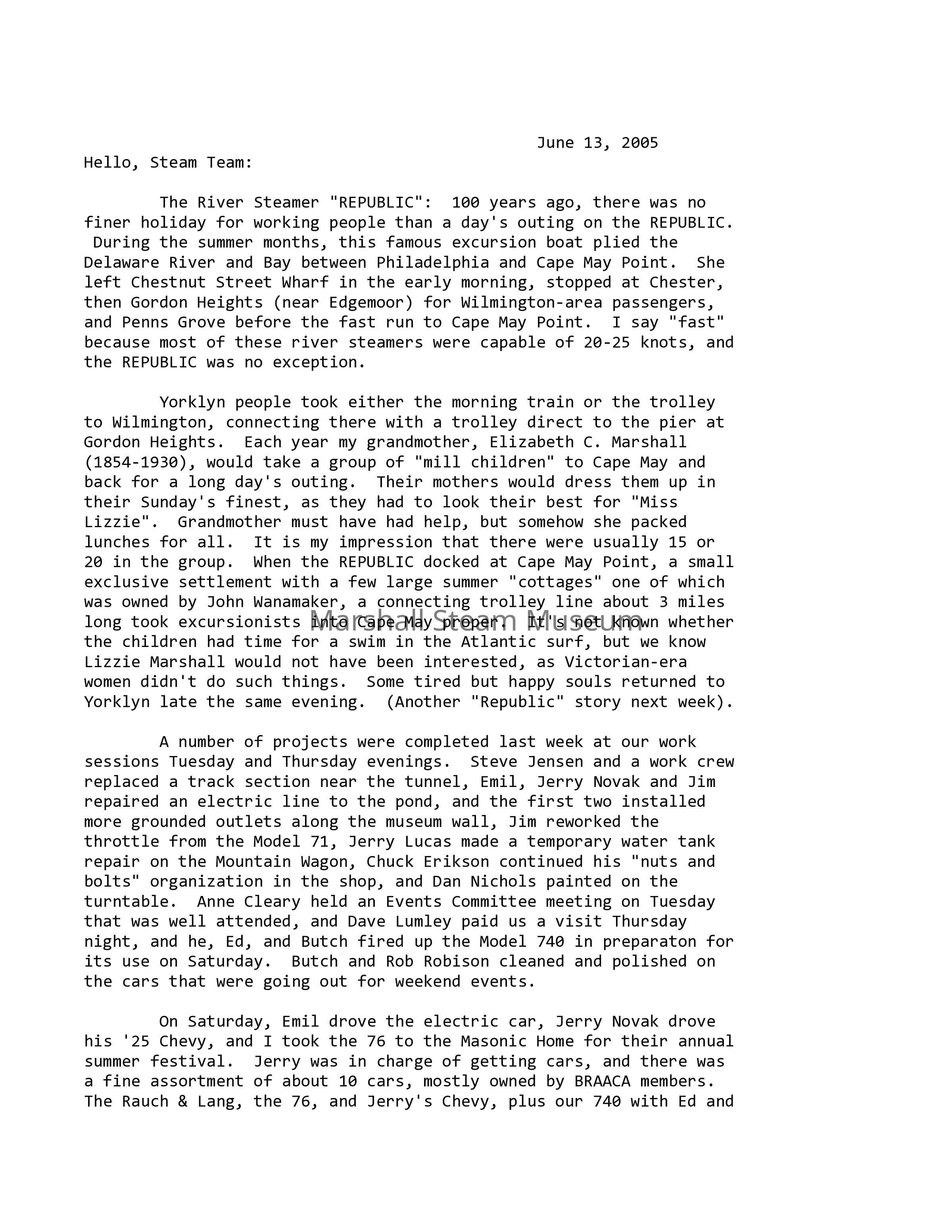 Yorklyn people took either the morning train or the trolley to Wilmington, connecting there with a trolley direct to the pier at Gordon Heights. Each year my grandmother, Elizabeth C. Marshall (1854-1930), would take a group of "mill children" to Cape May and back for a long day's outing. Their mothers would dress them up in their Sunday's finest, as they had to look their best for "Miss Lizzie". Grandmother must have had help, but somehow she packed lunches for all. It is my impression that there were usually 15 or 20 in the group. When the REPUBLIC docked at Cape May Point, a small exclusive settlement with a few large summer "cottages" one of which was owned by John Wanamaker, a connecting trolley line about 3 miles long took excursionists into Cape May proper. It's not known whether the children had time for a swim in the Atlantic surf, but we know Lizzie Marshall would not have been interested, as Victorian-era women didn't do such things. Some tired but happy souls returned to Yorklyn late the same evening. (Another "Republic" story next week).